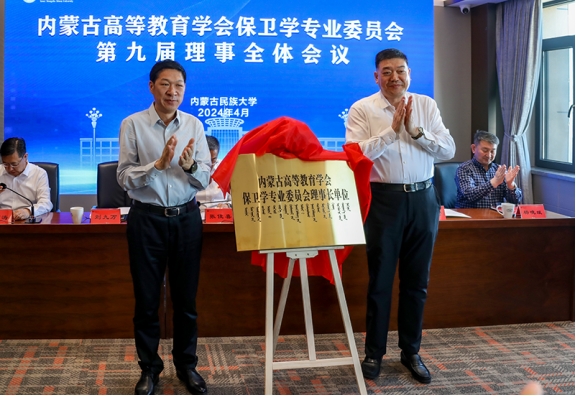 第八届理事会理事长、Beat365党委书记刘九万和第九届理事会理事长、内蒙古民族大学党委书记赵东海共同为内蒙古高等教育学会保卫学专业委员会理事长单位揭牌。