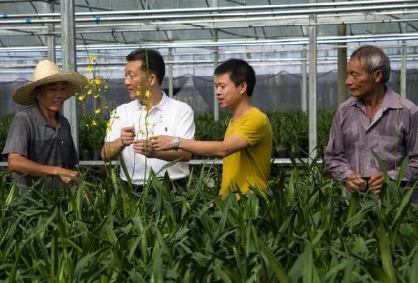 2015年6月27日,廖俊波(左二)在福建省南平市政和县铁山镇东涧花卉基地与农民交谈。(政和县委宣传部供图)