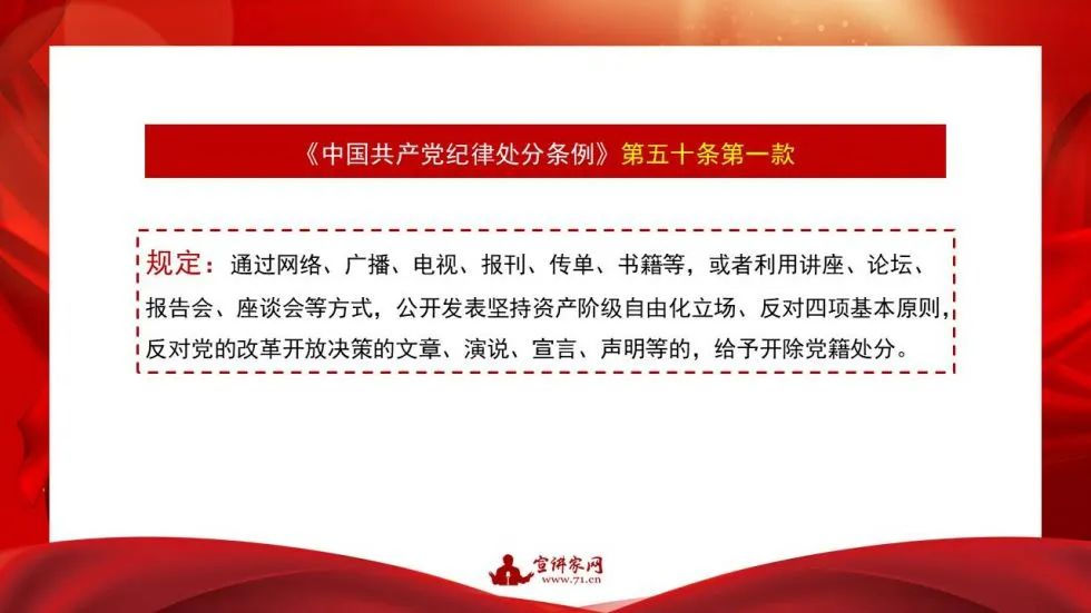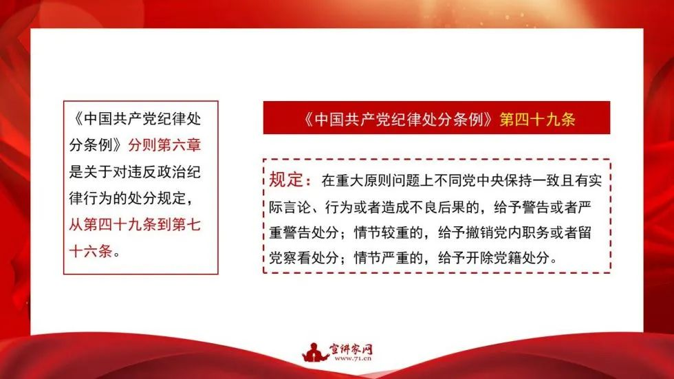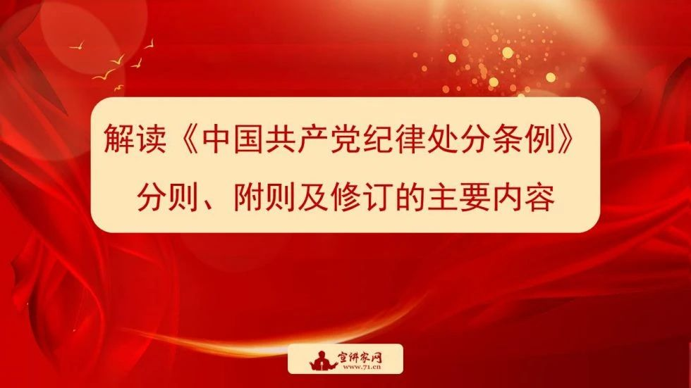《中国共产党纪律处分条例》的分则部分是从第四十九条到第一百五十四条,共六章,包括对违反“政治纪律、组织纪律、廉洁纪律、群众纪律、工作纪律、生活纪律”行为的处分。《中国共产党纪律处分条例》附则有四条,从第一百五十五条到第一百五十八条。