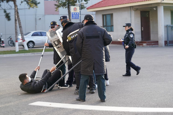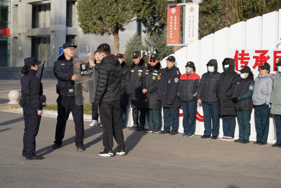 海东路派出所两位警官为大家讲授钢叉防暴盾、应急棍等常用安保器械的规范使用方式及如何快速组成最小作战单元的技巧方法。随后,安保人员有组织进行应急棍、防爆盾、叉等器材的协同配合训练并进行反恐防暴模拟演练演练中,安保队伍利用盾叉结合、缓步推进和冲击前进等战略战术制服“暴徒”。