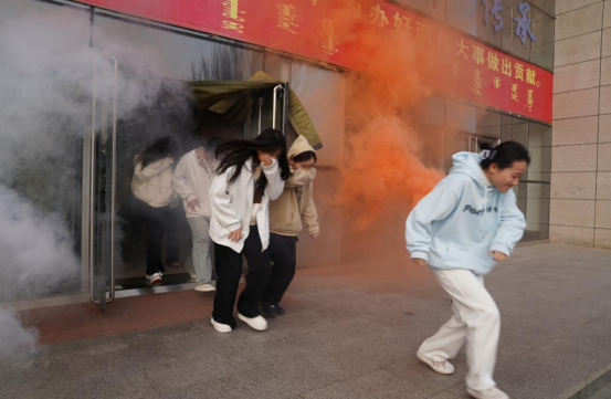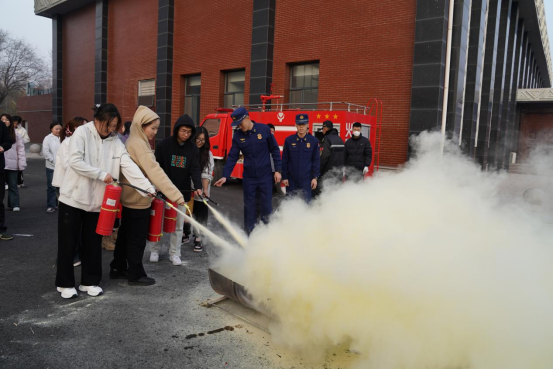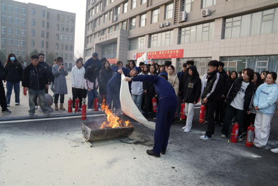 其次,在综合楼进行模拟火灾逃生演练,指导学生按照正确逃生路线迅速有序向安全区域撤离。随后在室外场地为师生详细讲解并示范灭火器、灭火毯的正确使用方法,大家积极参与灭火器实践操作,体验灭火过程,在紧急情况下迅速有效地扑灭初期火灾。