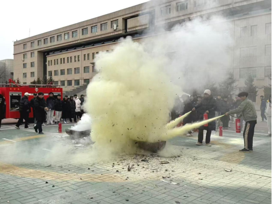 其次,在体育馆北侧场地进行应急逃生演练,模拟火灾情景,包括火情报警、初期火灾扑救、人员疏散等环节。演练过程中,同学们按照预案迅速响应,有序疏散、安全撤离。随后教官详细讲解并示范消防器材的正确使用技巧,同学们积极参与并体验火灾应急处理过程,进一步提升了消防应急处置能力