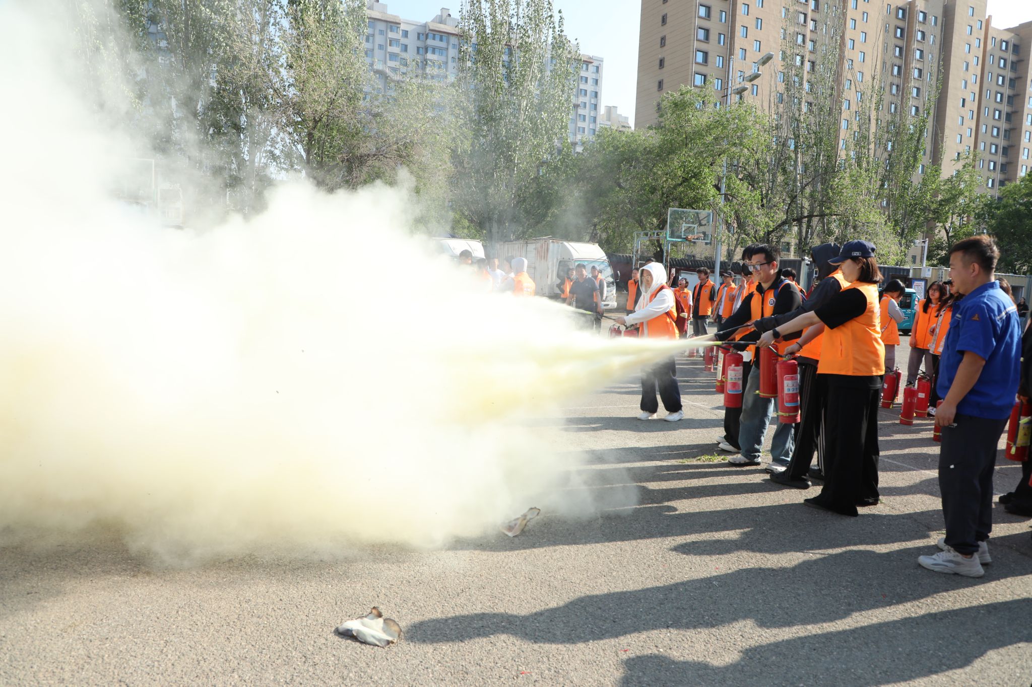 首先,周老师为大家详细讲解了灭火器 “一提、二拔、三握、四压”的操作要领并进行现场演示,同时强调了使用灭火器过程中的注意事项。随后模拟初期火灾场景,周老师指导同学们亲身体验灭火器实操过程,学生们反复练习,在动手操作中掌握应急灭火技能,同时深刻体会到消防工作的专业性与严谨性。