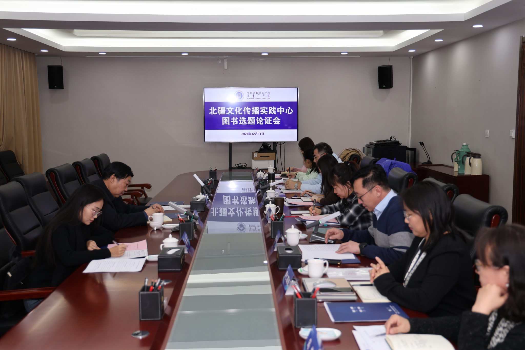 12月11日,学校北疆文化传播实践中心在办公楼二楼会议室召开图书选题论证专题会议,校党委副书记格根哈斯、内蒙古自治区人大科教文委副主任委员吴海龙、内蒙古出版集团远方出版社书记、社长苏那嘎、新闻传媒学院党总支书记苏伦高娃、院长额尔敦毕力格及部分教师代表参加会议。