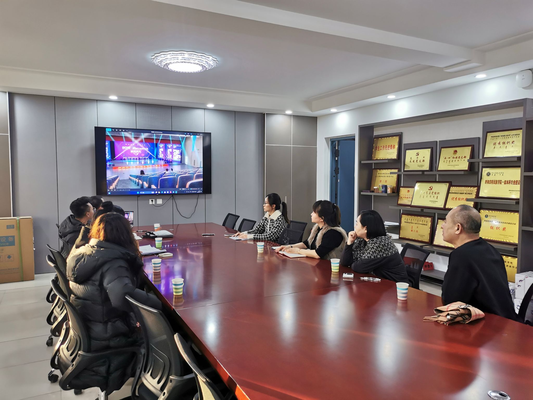 会上,中城恒业设计团队详细介绍了设计方案,包括空间布局的优化、设施设备的升级、消防系统的完善以及整体视觉效果的提升等方面。随后,苏伦高娃强调了演播厅在教学、实践和校园文化活动中的重要作用,希望通过此次升级改造,充分发挥演播厅最大的教学效益和利用率,满足教学要求和公共服务需求,并对设计方案提出了一些具体的建议和意见。