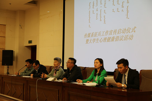 2016年5月11日晚,传媒系在图书馆一楼报告厅举办了征兵宣传工作启动仪式暨大学生心理健康倡议活动,学生处心理健康辅导中心娜布其玛老师、传媒系党总支书记常喜、副主任额尔敦毕力格、办公室主任成格乐、团总支负责人齐丹以以及全系学生和班主任参加了会议。会议由党总支书记常喜主持。