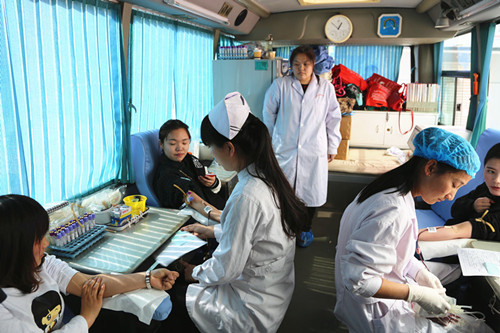 传媒系成功举办爱心献血活动 2015年9月11日,由传媒系团总支与内蒙古血液中心联合主办、“鸿雁”青年志愿者协会承办的以“雷锋精神永存点滴热血助人”为主题的大型爱心献血活动如期举行。此次爱心献血活动共有23名师生成功献血,献血总量为7600mm,为内蒙古血液中心及时补充了库存血量。 同学们踊跃报名 献血车上