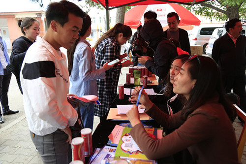 同学们看到了蒙语新媒体宣传活动条幅后纷纷前来参加,大家扫了二维码关注了微信公众平台,还预定了手机报并且就自己喜欢的网站及喜欢的内容与记者进行了交流。在短短的时间里有500多名学生参加了本次活动,有360名同学现场关注了微信公众平台。
