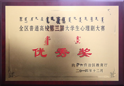 传媒系心理剧《相亲》参加 全区高校第三届大学生心理剧大赛获优秀奖 2014年12月5日,我系心理剧《相亲》代表学院参加了由内蒙古自治区教育厅主办、内蒙古师范大学承办的全区高校第三届大学生心理剧大赛并获得优秀奖,本次大赛分为蒙汉两组,来自全区的30个剧目参加了比赛。 参赛的心理剧《相亲》为原创作品,由齐丹老师指导,奈日格勒、阿尔希尼玛、海日、布特格其、哈布尔、萨日盖,阿拉唐珠拉等七名同学参演。 本剧通过大学生相亲故事,反映了不同大学生的心理性格,以幽默诙谐的表演形式呼吁大学生树立正确的恋爱观。