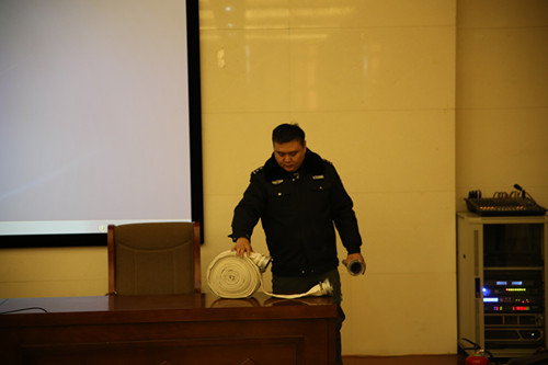 尚老师就消防安全的概念、校园常见火灾类型、应急逃生办法、常见灭火器材的使用和保护等几个方面为大家详细讲解了消防安全基本常识。李老师为大家演示了灭火器和水枪的使用方法,随后为大家播放了安全警示片。