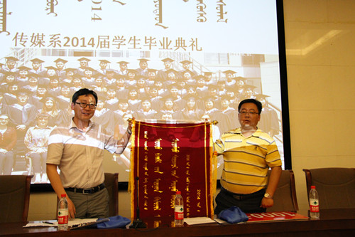 2014年5月30日下午7点,传媒系在图书馆一楼报告厅举办了2014届学生毕业典礼。毕业典礼上,优秀学生代表楚娜等同学作了实习和考研经验交流,毕业生代表阿日滨为母校深情致辞,吴旦旦代表全体毕业生为传媒系全体老师献上写有“师恩深似海,桃李满天下”的锦旗。