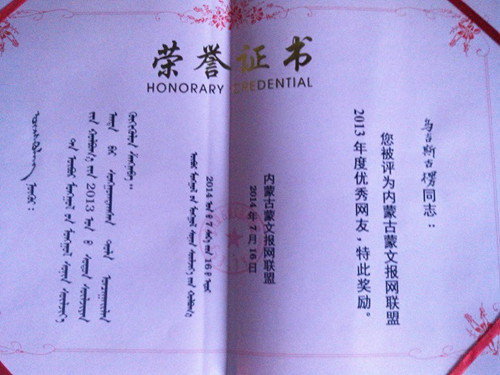内蒙古蒙文报网联盟优秀网友奖