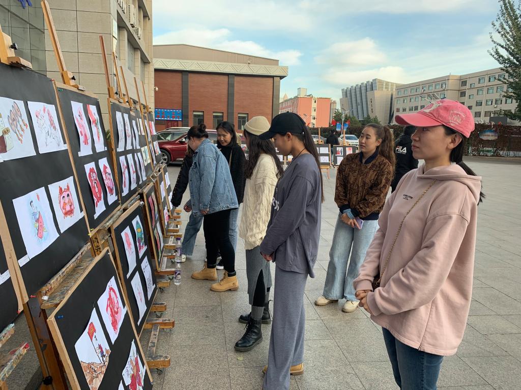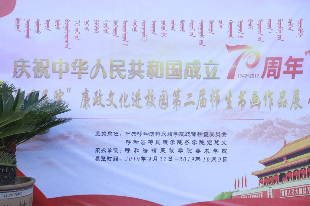 由校纪委主办,美术学院承办的庆祝中华人民共和国成立70周年暨“清风民院”廉政文化进校园第二届师生书画展在学校开展。10月14日,我院部分没课师生集体在综合楼前观看了展览。