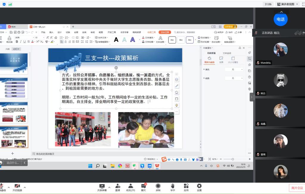 会上,旭日老师提出“先就业,后择业”的建议,引导学生们树立正确的就业观,向学生们强调要认清自我,积极争取,踊跃报名的观念。还将自己的经验分享给大家,通过讲述自己的就业经历给同学们建议就业一定要积极行动,敢于尝试,才能把握更多就业机会。随后,详细讲解了三支一扶、社区民生的政策解析,分析了近期毕业生的就业形势,持续为大家推送就业信息并为毕业生考研复试和求职就业提供帮助。