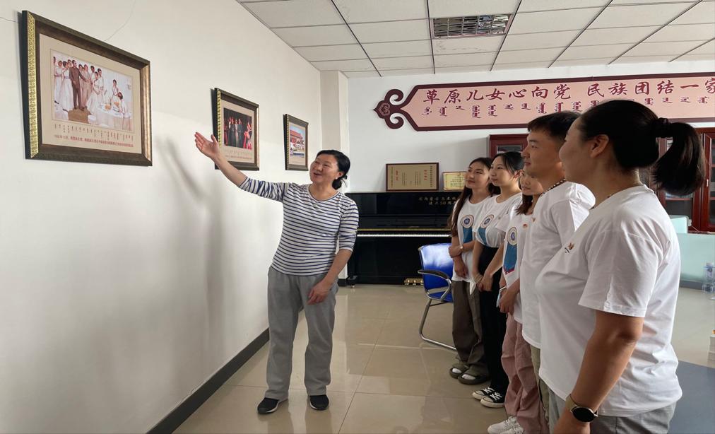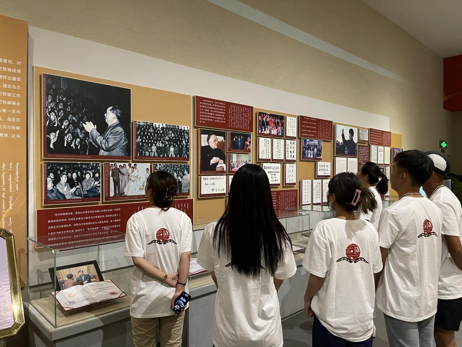 实践团一行人在指导教师旭日的带领下前往内蒙古自治区第一支乌兰牧骑诞生地—锡林郭勒盟苏尼特右旗乌兰牧骑。首先大家走进苏尼特右旗乌兰牧骑展览厅参观学习,映入眼帘的是苏尼特右旗乌兰牧骑成立65年来历届文艺工作者简介及历年文艺演出的精彩画面。通过讲解和图片资料,实践团全体成员了解了乌兰牧骑光辉的发展历程,感受乌兰牧骑在艰苦条件下扎根基层、服务人民的红色文艺轻骑兵精神。