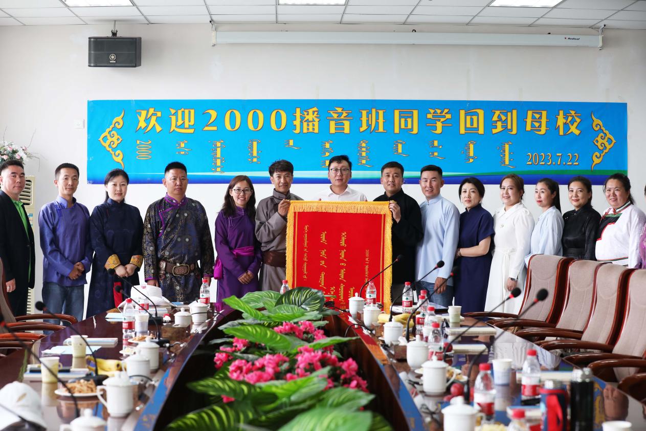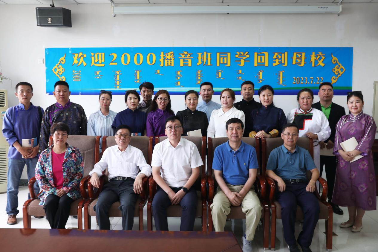 新闻传媒学院2000级播音与主持艺术班毕业20周年,7月22日,校友荣归母校,在综合楼11层会议室与曾时师友进行了一次难忘的座谈交流。曾任新闻传媒学院教师,现学报编辑部主任旺·巴图吉日嘎拉、管理学院院长哈斯通力嘎及退休教师莫·照日格图、通拉嘎老师参会。座谈会由学院院长额尔敦毕力格主持。