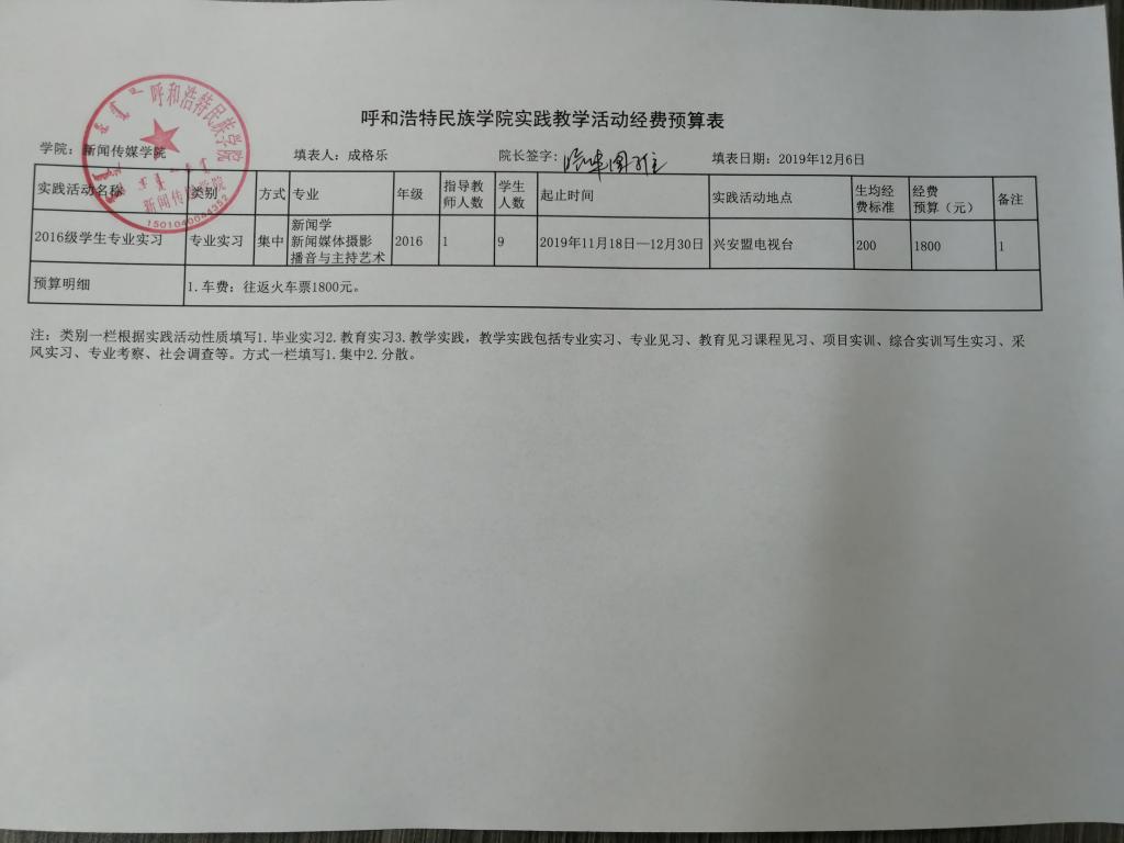 根据《Beat365唯一官方网站实习实践教学经费管理办法》要求,现将公示2019—2020学年度第一学期新闻传媒学院2016级学生专业实习计划及经费预算。2016级新闻学(含新闻媒体摄影)、播音与主持艺术班3个班共9名学生参加了本次毕业实习。申请经费为1800.00元,用于学生交通费上。公示期限为3天,2019年12月6日至2019年12月8日。如有异议,请在公示期间内向院领导反映。 新闻传媒学院 2019年12月6日