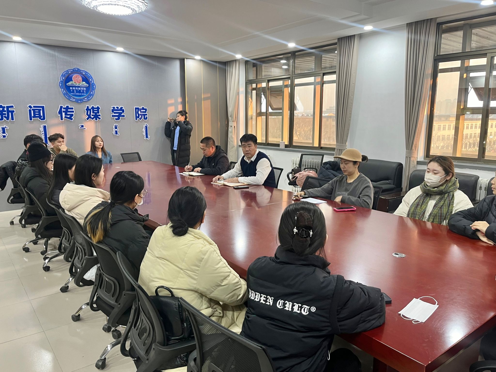 12月12日,2022级播音与主持艺术班的包联领导、组织部部长吴阿古拉来看望学生并进行座谈交流,学院党总支书记包玉柱、22级播音班班主任图木舍携学生参加座谈会。