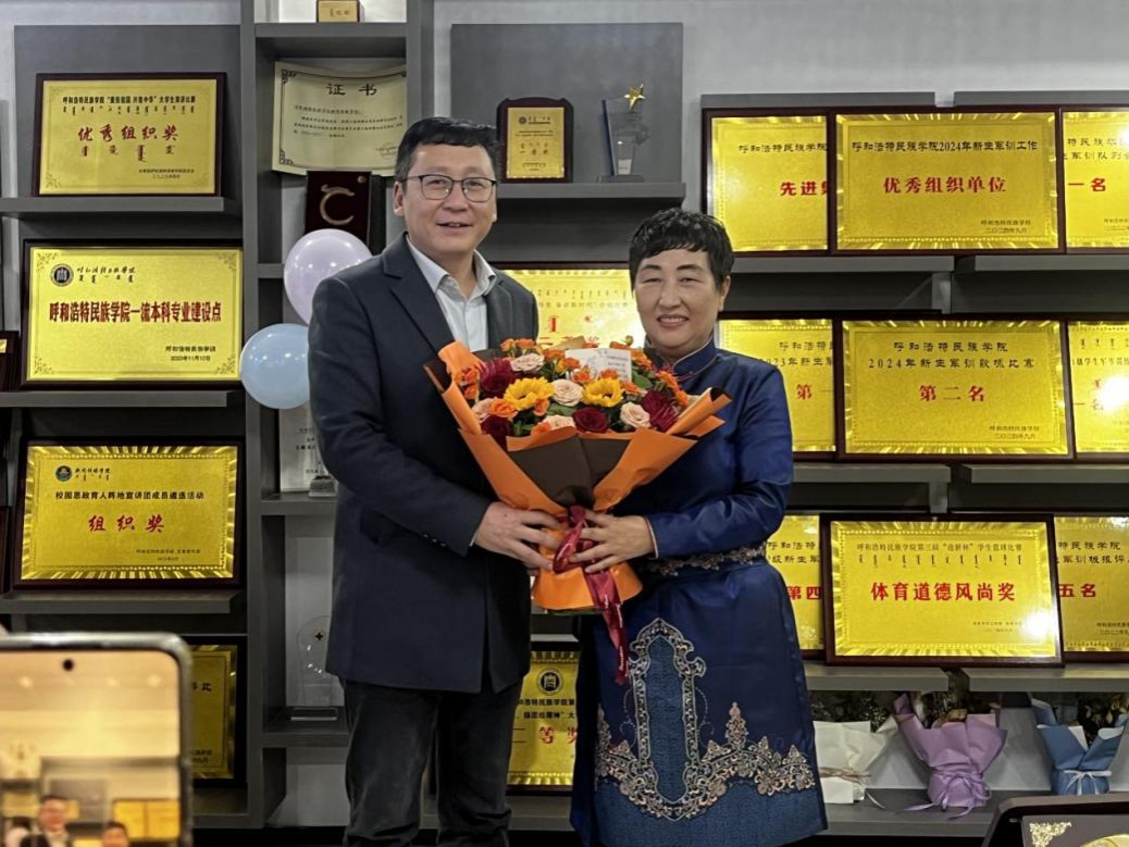 随后,学院党总支书记苏伦高娃、院长额尔敦毕力格为白塔娜教授颁发纪念奖章,表达对白塔娜教授的崇高敬意和诚挚祝福。