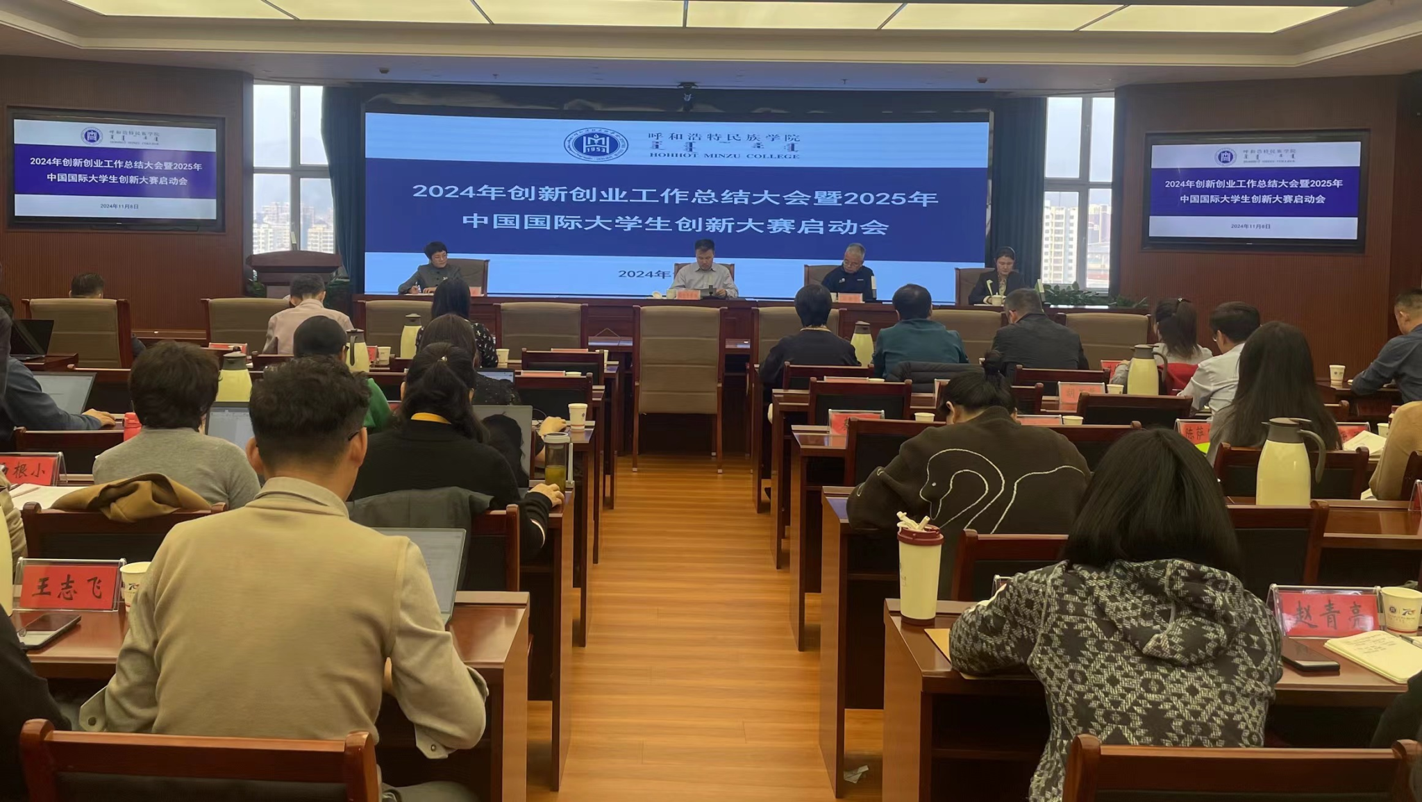 11月8日,Beat3652024年创新创业工作总结大会暨2025年中国国际大学生创新大赛启动会在综合楼12楼会议室召开。学校党委委员、副校长额尔敦布和出席会议并讲话。各二级学院书记、院长、特邀专家、研修班班教师、创新创业中心全体成员80余人参加会议。创新创业学院中心副主任包桂英主持会议。