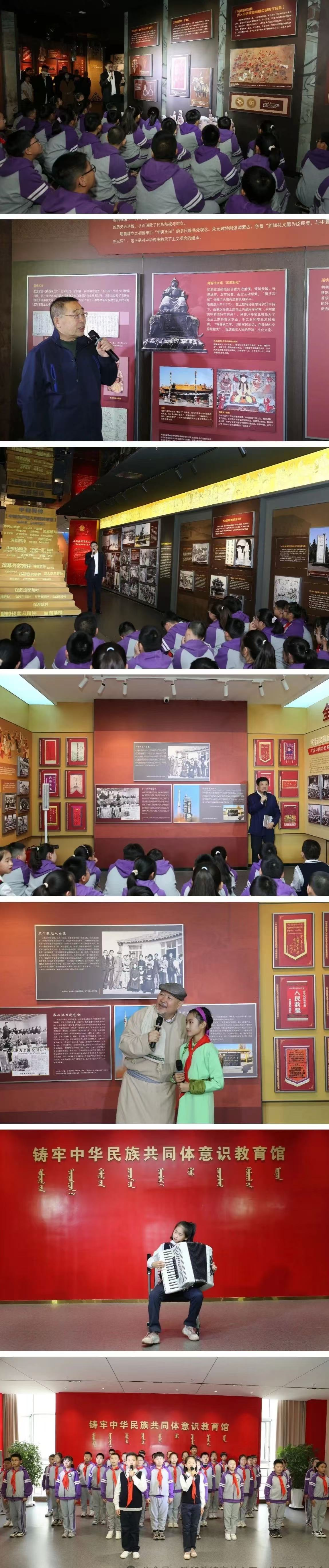 揭牌仪式后,进行了“铸牢”馆里启“铸牢”宣教活动。活动聚焦馆教一体、馆创一体、馆演一体,邀请“五老”讲解团,即“老马说马”博主马智聪,讲述马镫的起源、演变及历史作用;邀请历史文化学者、老旧城人曹建成,讲述从战国云中古城到呼和浩特,城市几次更名和背后不同历史时期的交往交流交融史实;邀请大型交响诗画《我愿以身许国》老创作人,讲述中国精神谱系中的“两弹一星”精神;邀请土生土长的额济纳人、老教授殷俊海,讲述内蒙古额济纳旗人民为支持航天事业“三易旗府”的故事;邀请内蒙古民族艺术剧院演员芒来和绿地小学学生吴非凡共同演绎《额济纳河的诉说》主题短剧,通过爷孙对话展现额济纳旗人民“最好牧场让航天”,舍小家为大家的爱国情操。活动中,春蕾第一小学学生孙婉然还表演了手风琴独奏《红星歌》,五一班全体同学共同朗诵了《少年中国说》,表达了同心共筑中国梦的决心。