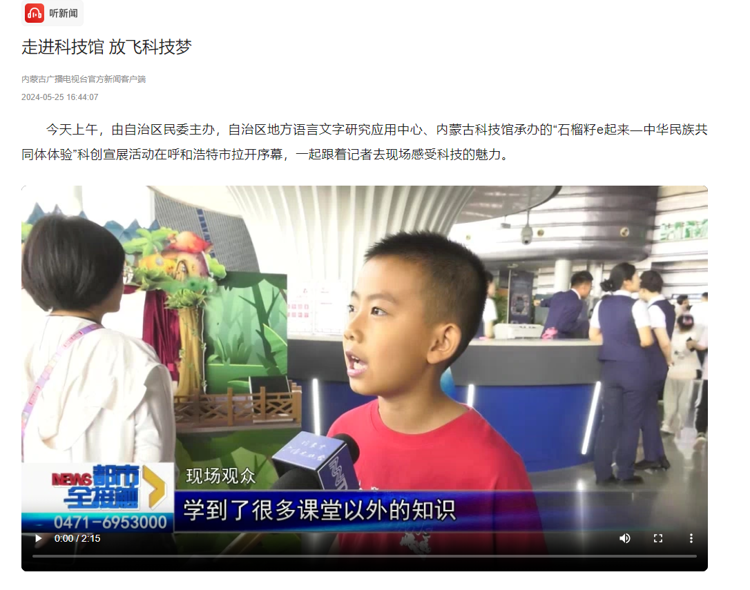 为深入学习贯彻落实习近平总书记关于加强和改进民族工作的重要思想,按照学校《2024年“民族政策宣传月”“民族法治宣传周”活动方案》和铸牢中华民族共同体意识“一院一品”活动安排,5月25日,统战部联合美术学院、音乐学院前往内蒙古科技馆,参加由自治区民委主办,自治区地方语言文字研究应用中心、内蒙古科技馆承办的“石榴籽e起来——中华民族共同体体验”科创宣展活动。