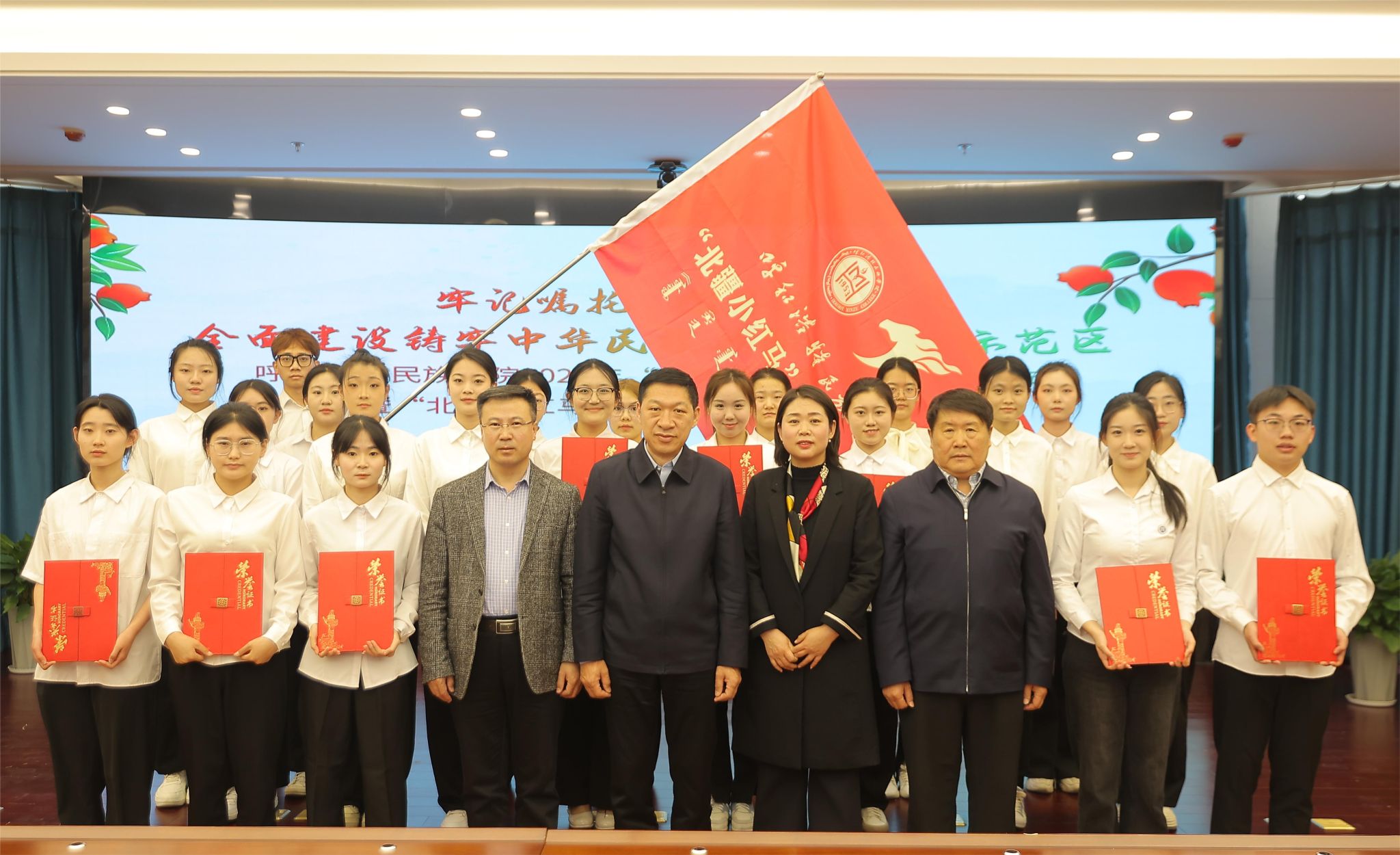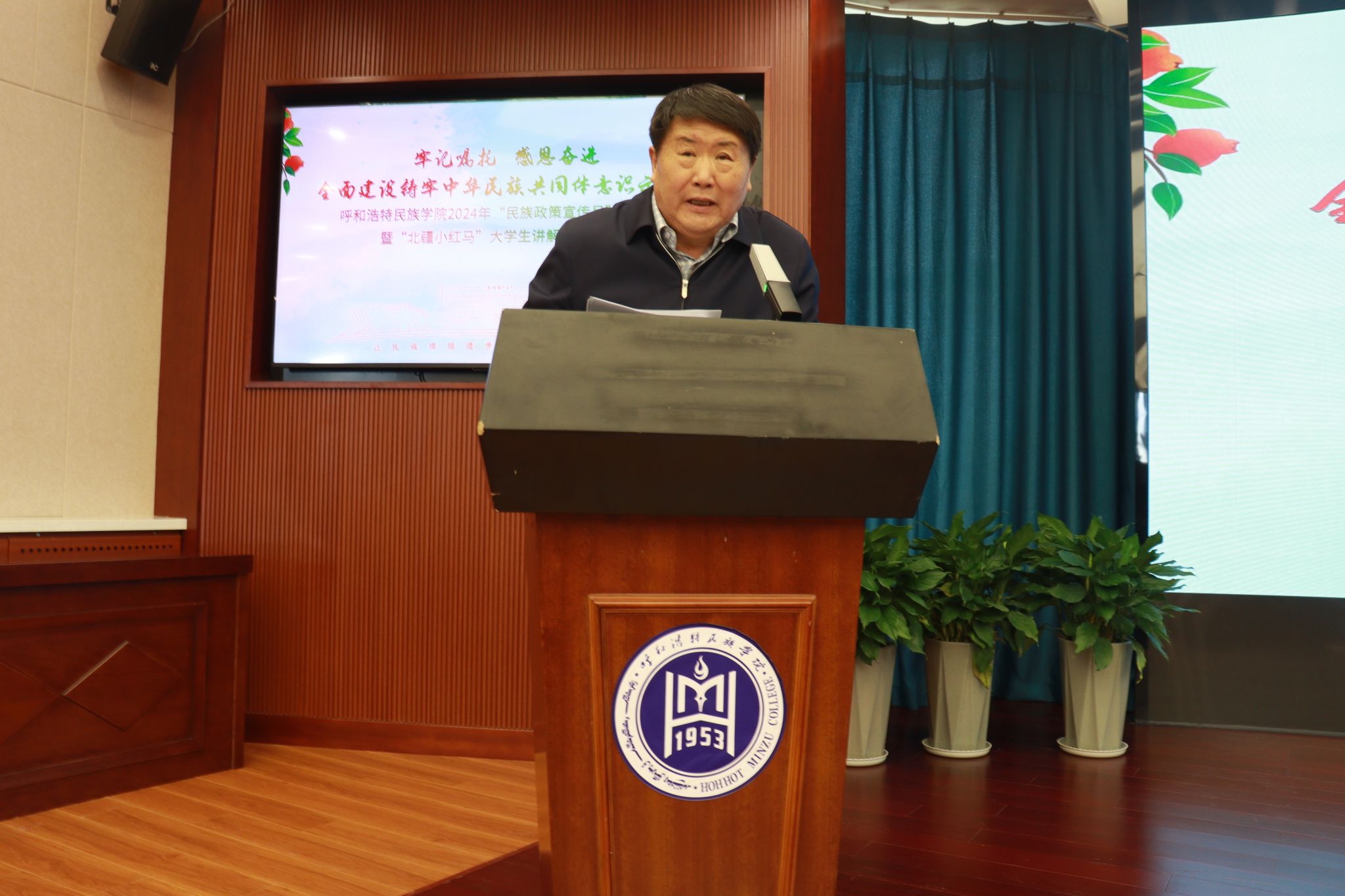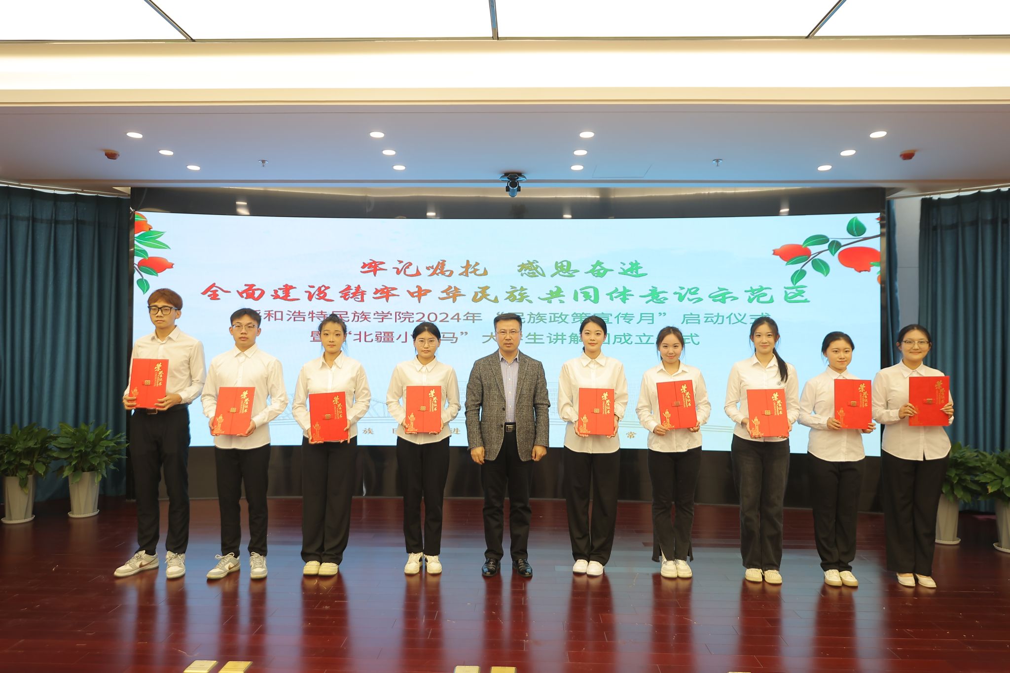 仪式上,党委书记刘九万向“北疆小红马”大学生讲解团指导教师刘丽颖授旗,额尔敦布和副校长向优秀讲解员颁发证书,包君部长解读了《民族政策宣传月活动方案》。