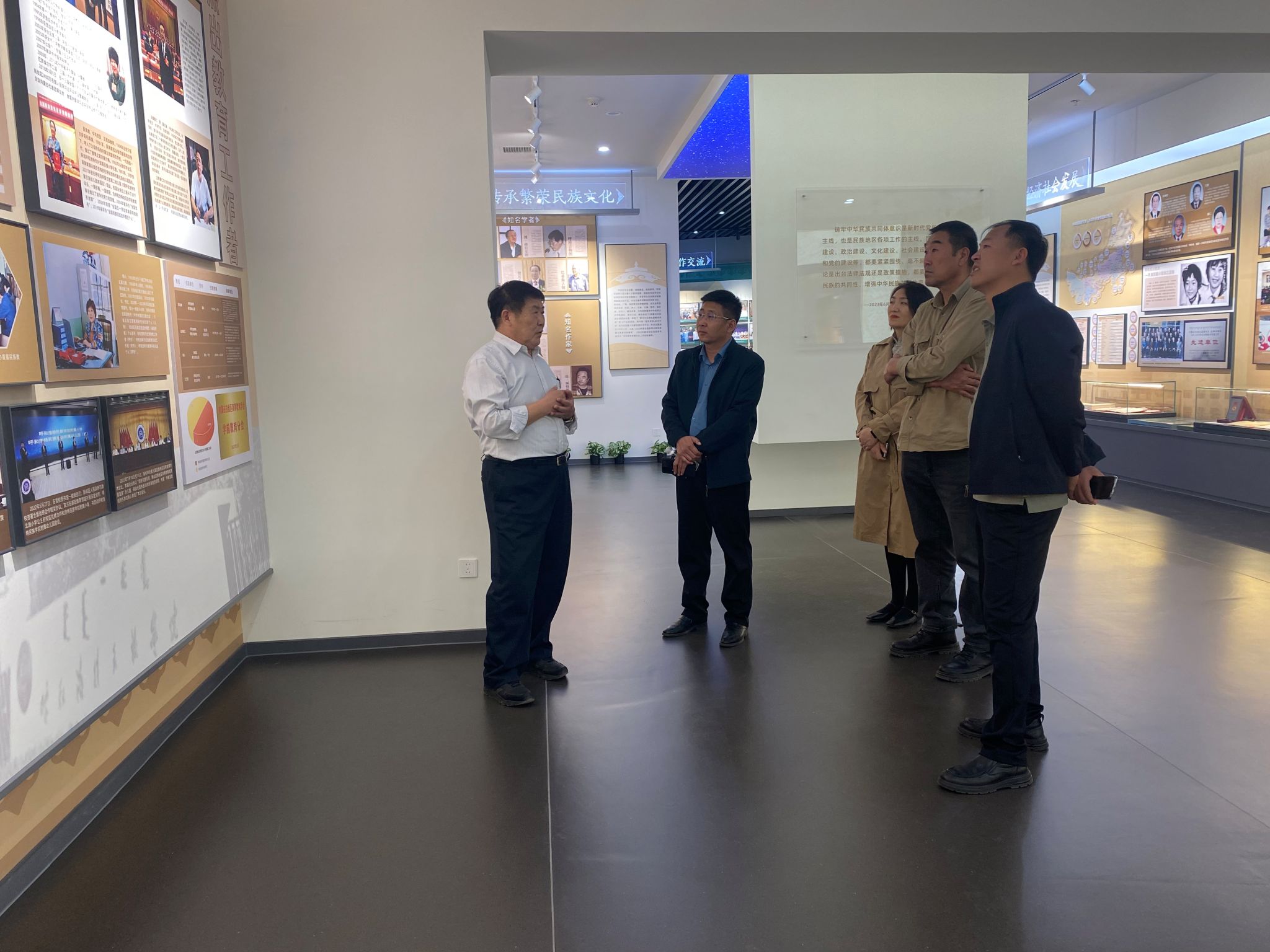 4月9日,乌力吉口岸管理委员会党政综合办公室主任曹慧杰、党群工作部部长额尔登、阿拉善盟党校副教授那顺、档案史志馆馆长苏依勒图等一行7人组成专题考察团,就建设铸牢中华民族共同体意识教育馆工作来Beat365考察调研。党委委员、统战部部长包君,铸牢基地负责人、民族学学院副院长青斯琴陪同。 考察团一行人在办公楼三楼会议室就铸牢中华民族共同体意识教育馆的建设工作、展陈模式、展陈思路等进行座谈交流。 座谈会后,考察团参观了民族团结文化长廊,并深入校史馆、铸牢中华民族共同体意识教育馆,实地了解展馆建设和布展工作。