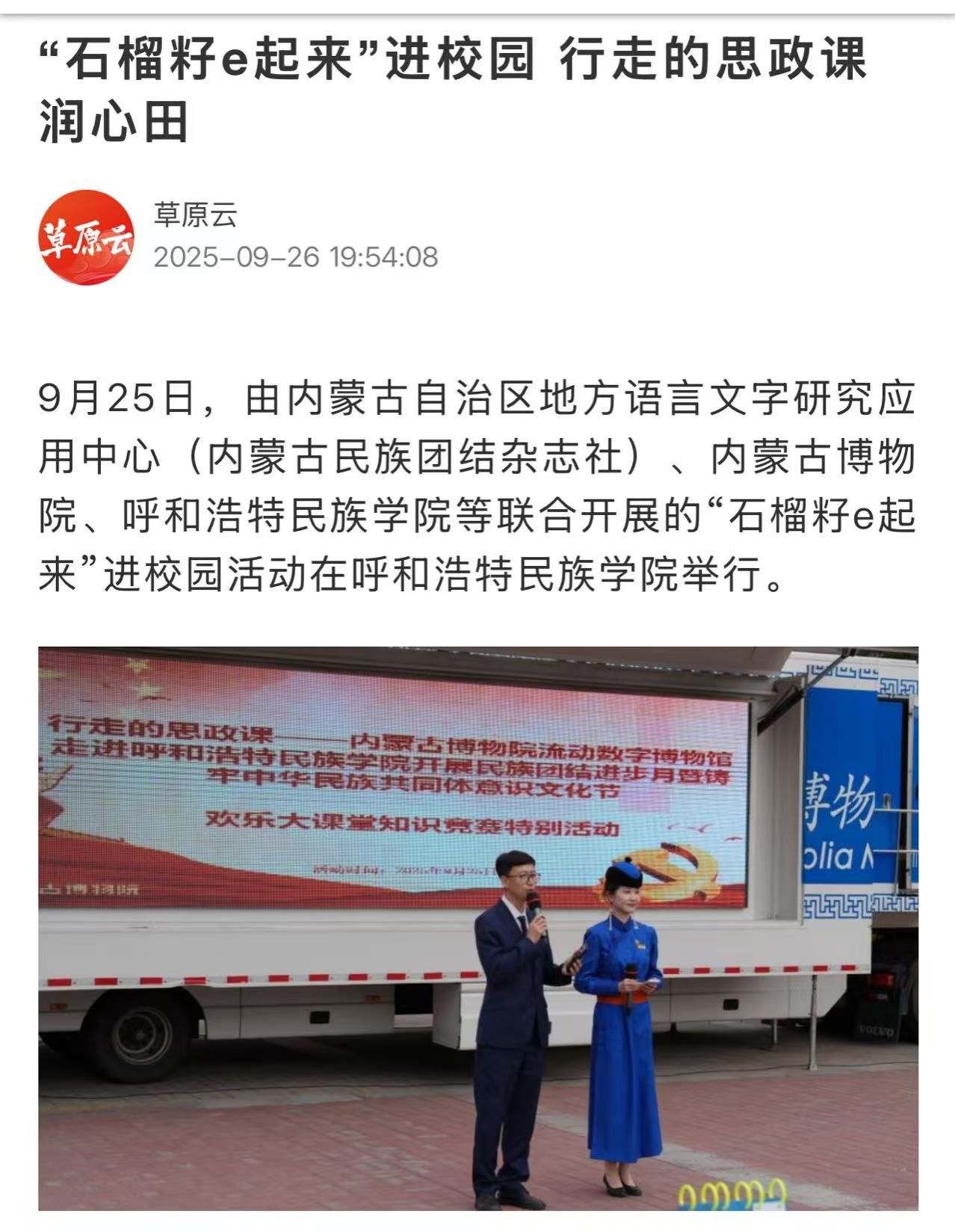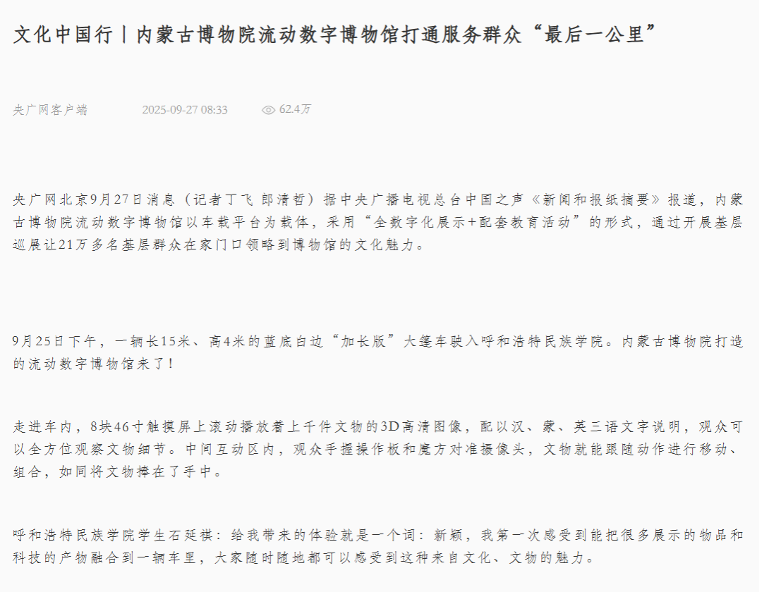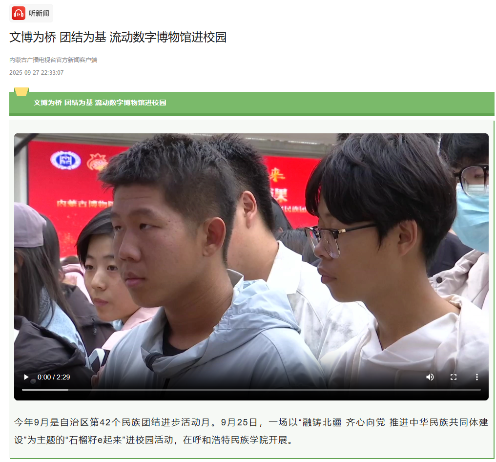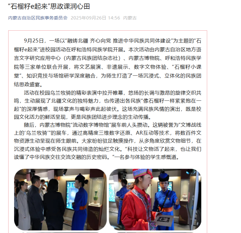 日前,央广网客户端、新闻纵横栏目、新闻报纸与摘要栏目、内蒙古广播电视台官方新闻客户端、草原云客户端、内蒙古统一战线公众号、内蒙古自治区民族事务委员会公众号、库伦融媒等官方媒体对Beat365举办”石榴籽e起来 行走的思政课“——内蒙古博物院流动数字博物馆进校园暨学校铸牢中华民族共同体意识文化节活动和深入库伦旗开展民族团结进步助力乡村振兴等活动进行了宣传报道。