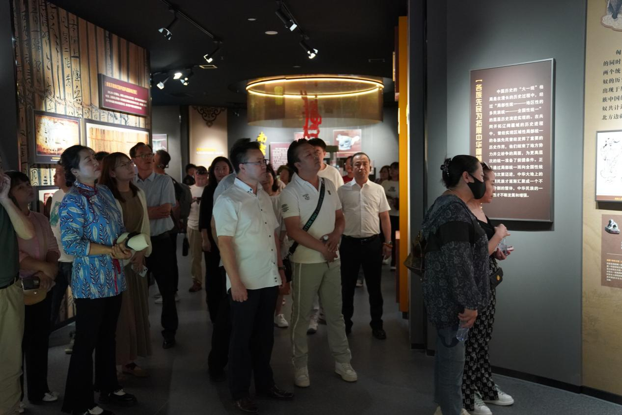 留联会一行首先参观了学校铸牢中华民族共同体意识教育馆。展览内容以习近平总书记提出的“铸牢中华民族共同体意识,就是要引导各族人民牢固树立休戚与共、荣辱与共、生死与共、命运与共的共同体理念”重要思想为指引,以铸牢中华民族共同体意识为主线,以《中华民族共同体概论课》为参照,以各民族交融汇聚的中华民族共同体的起源、形成和发展为脉线,以沉浸式的中华民族共同体时空隧道、艺术浮雕、数字投影、答题测试、历史照片和珍贵展品等多种形式,综合展示多元一体的中华民族形象和命运共同体的伟大历程,具有较高学术性、专业性、权威性和综合性。