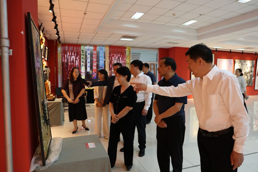 调研组一行考察了校史馆、铸牢中华民族共同体意识教育馆、民族团结进步文化长廊、时代楷模人物长廊,参观了美术学院2024届毕业生毕业作品展,“北疆记忆”非遗乐器展。