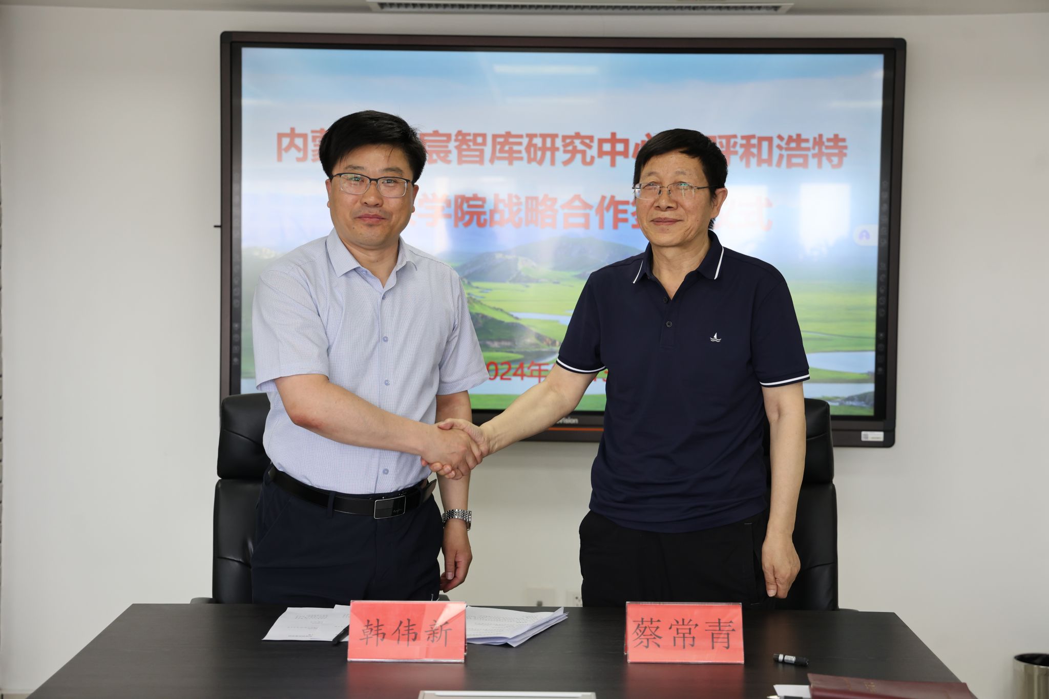 6月13日,校党委副书记、校长韩伟新带队赴内蒙古北宸智库研究中心签署战略合作协议,并开展座谈交流。校党委委员、副校长高喜天出席签约仪式。内蒙古北宸智库研究中心理事长蔡常青、北宸智库决策咨询专委会主任包思勤、北宸智库民族政策专委会主任毅松、北宸智库研究中心监事长马益波及北宸智库公共传播部吴志城出席签约仪式。