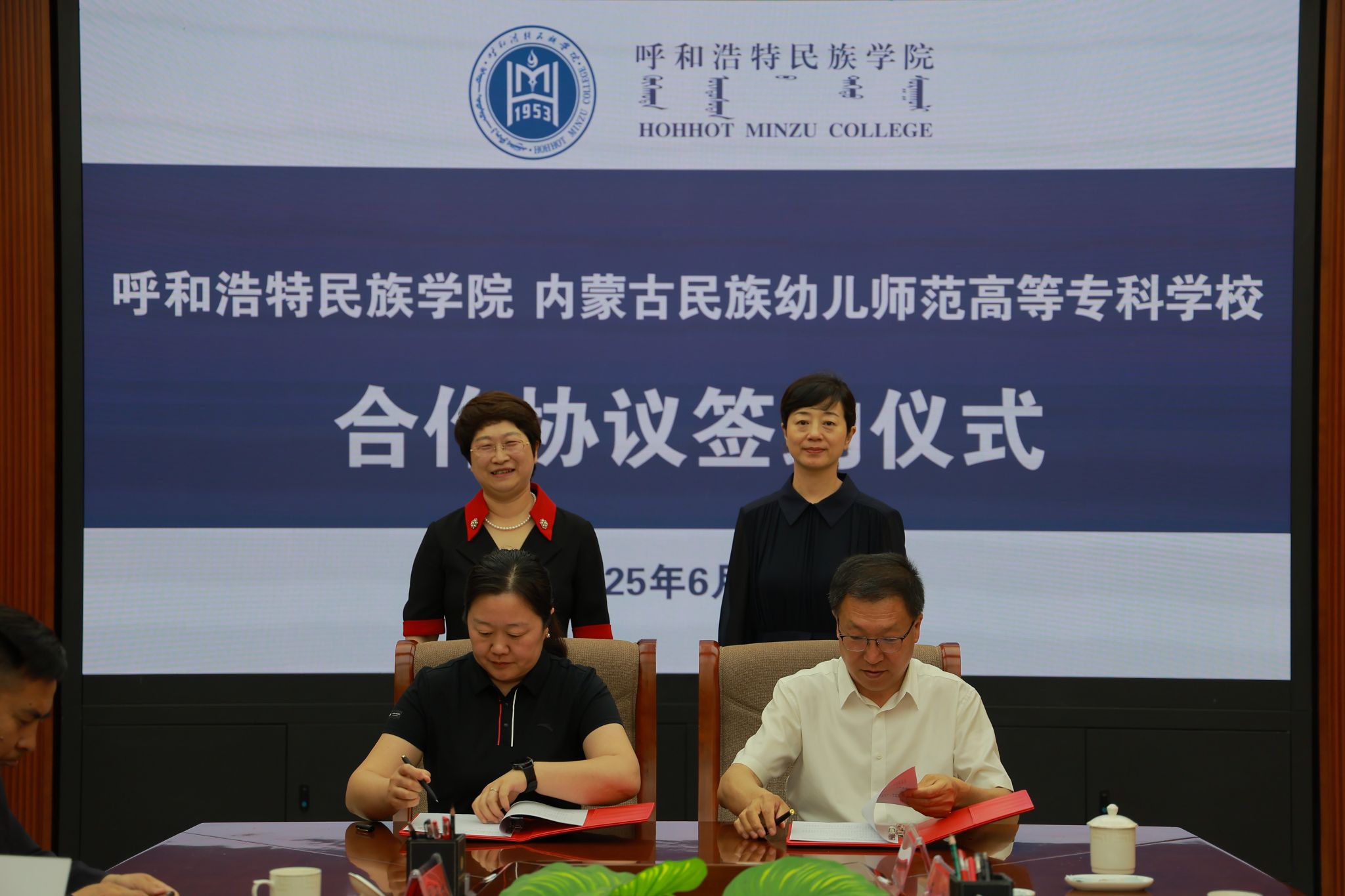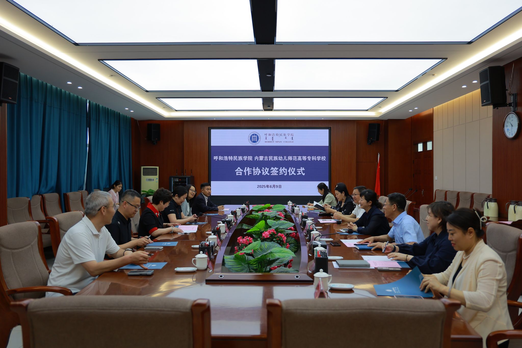 6月9日,内蒙古民族幼儿师范高等专科学校党委副书记、校长李春晖一行来校考察调研并签署合作协议。校党委书记刘九万在学校铸牢中华民族共同体意识教育馆会见了李春晖一行。党委副书记、校长王敏,党委委员、副校长高喜天,党委委员、副校长刘瑞鸿出席了签约仪式。会议由高喜天主持。