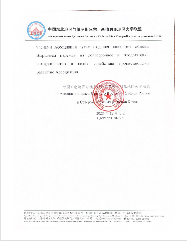 中国东北地区与俄罗斯远东及西伯利亚地区大学联盟于2012年9月由东北农业大学和俄罗斯太平洋国立大学发起成立。截至2023年9月,共有中方成员高校63所,俄方成员高校27所。目前由东北农业大学校长付强担任联盟中方主席,太平洋大学校长马尔芬担任联盟俄方主席。