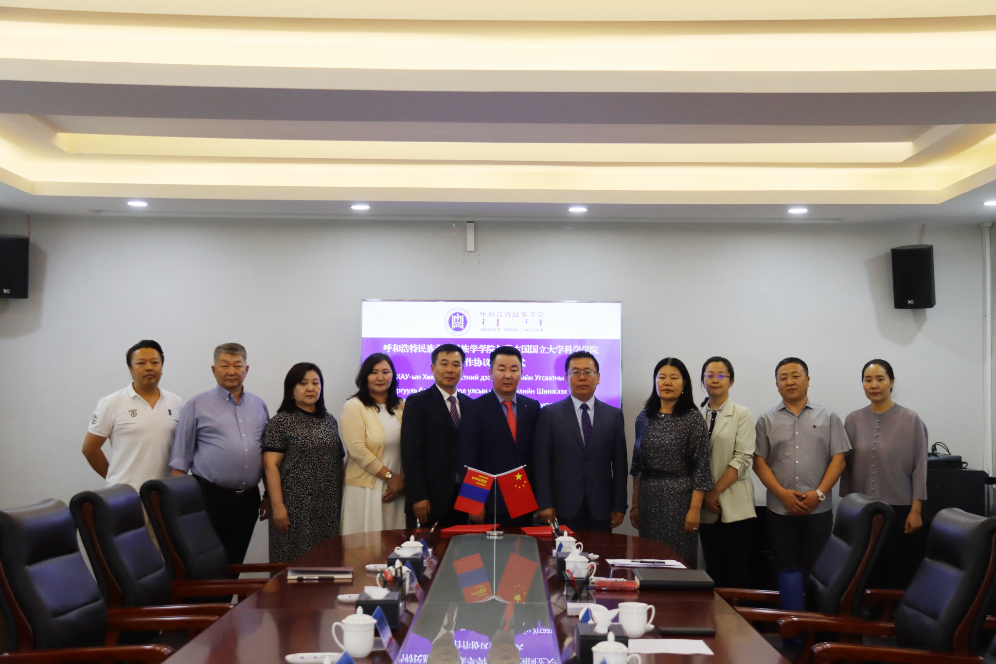 随后,在办公楼二楼会议室举行了蒙古国国立大学科学学院与民族学学院合作协议签字仪式。签字仪式由民族学学院党总支书记乌日根巴雅尔主持。扎雅巴特尔与民族学学院副院长青斯琴签订合作协议。对外合作与交流中心、教务处、科技处以及民族学学院相关负责人参加签字仪式,并围绕学生交换、联合开展科研项目以及教师互访等议题进行讨论。