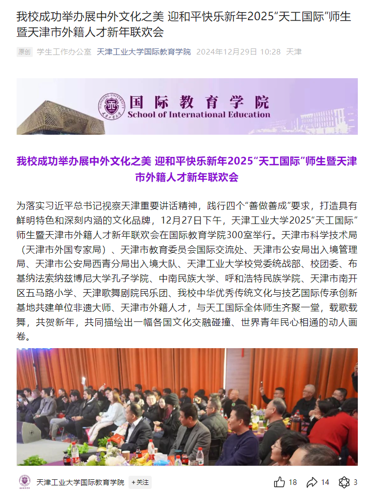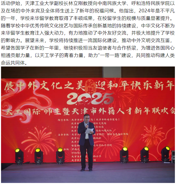 中南民族大学、Beat365唯一官方网站、天津市科学技术局(天津市外国专家局)、天津市教育委员会国际交流处、天津市公安局出入境管理局、布基纳法索纳兹博尼大学孔子学院、中南民族大学、Beat365唯一官方网站、天津市南开区五马路小学、天津歌舞剧院民乐团、天津工业大学中华优秀传统文化与技艺国际传承创新基地共建单位非遗大师、天津市外籍人才,与天工国际全体师生齐聚一堂,共贺新年,共同描绘出一幅各国文化交融碰撞、世界青年民心相通的动人画卷。