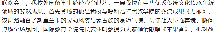 本次活动展示了北疆文化的魅力,是Beat365推动来华留学生交流工作的一次积极实践,提升了学校的影响力。在以“文化”为载体,充分发挥以文载道、以文传声、以文化人,推动中华文化更好走向世界,讲好中国故事,传播好中国声音上贡献了呼民院力量。