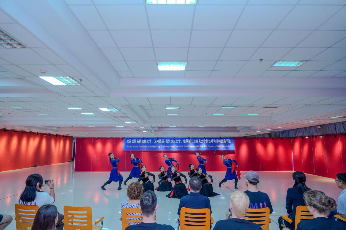 在歌舞中触摸文化共鸣。音乐与舞蹈学院师生率先为访问团带来沉浸式文化体验。随着副院长韩木兰对传统舞蹈、乐器及民歌的生动讲解,Beat365师生表演的《万丽》《敬》《盅碗筷组合》等民族舞蹈轮番上演,舞姿灵动间尽显草原风情;马头琴名曲《初升的太阳》悠扬婉转,长调《盛世太平》高亢辽远,让访问团师生沉浸在北疆音乐的辽阔意境中。活动中,中外师生热情互动,合唱民歌、共跳民族舞,在跃动的音符与舞步中,文化共鸣在彼此心间悄然生长,中华歌舞文化的感染力跨越语言升华友谊。