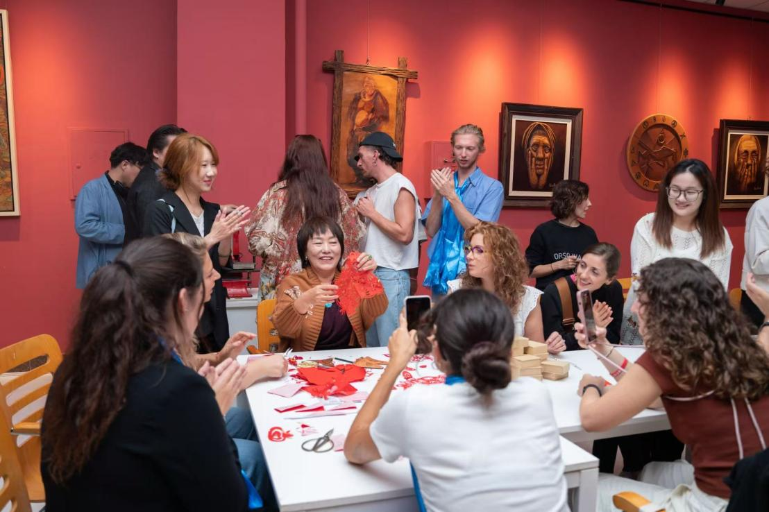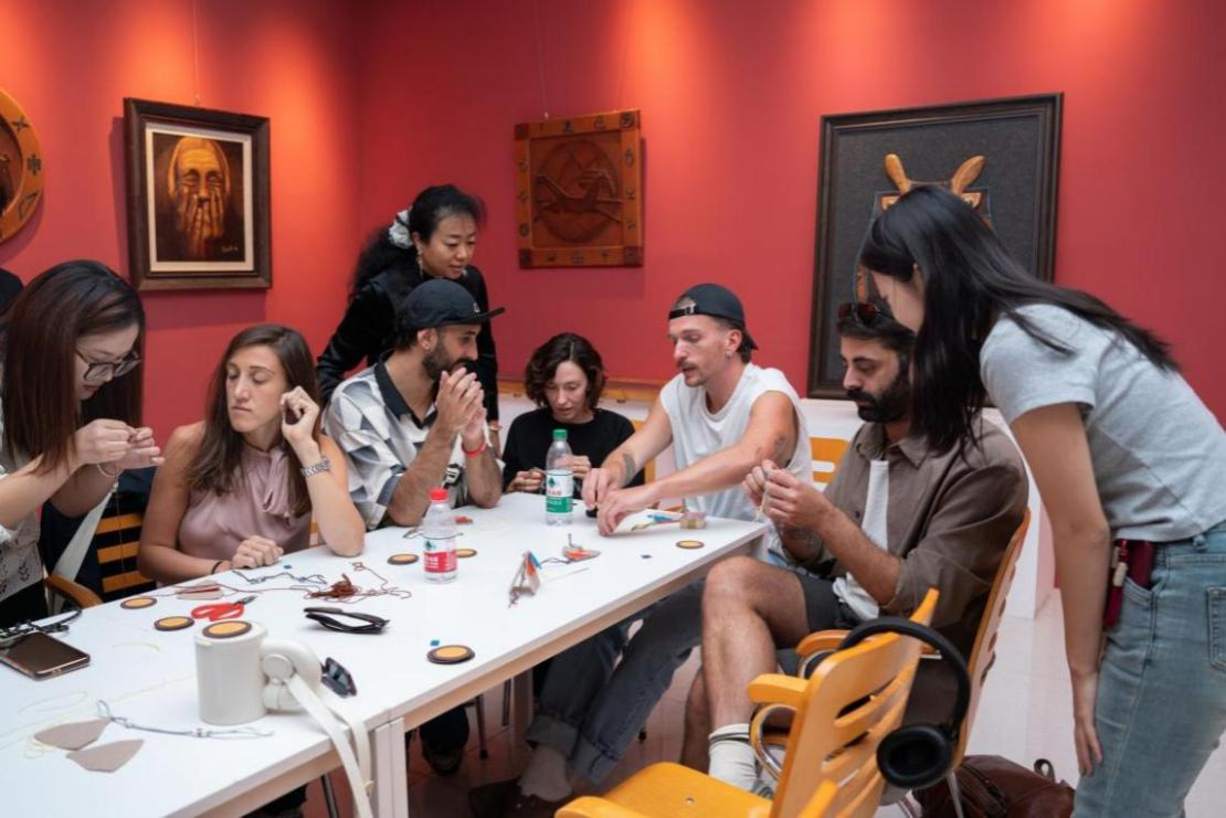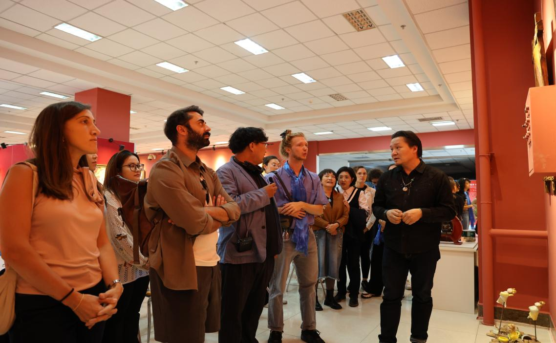 艺术交流之外,非遗文化体验与武术教学实践让交流维度进一步拓展。在美术与设计学院教师木仁的带领下,访问团参观了Beat365师生非遗美术作品展,并走进自治区级“木仁创新工作室”,沉浸式体验毛毡、剪纸、皮画等非遗手工艺品制作。这一过程不仅让意大利师生感受了中国传统非遗的艺术风格与匠心精神,更成为Beat365美术与设计学科依托地域文化特色、开展实践教学与文化传播的生动展示。