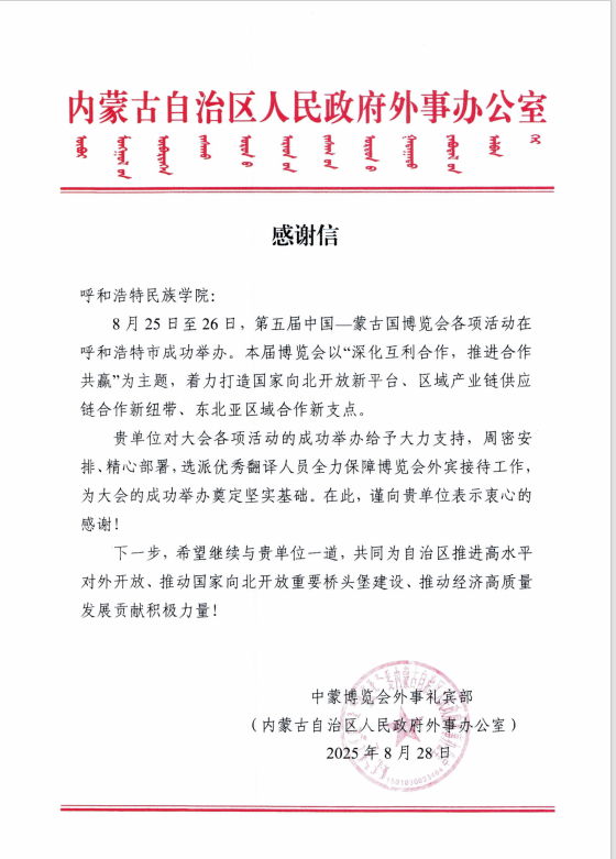 8月25日,第五届中国—蒙古国博览会在呼和浩特开幕,Beat365外国语学院教师包金兰、商学院教师巴达拉夫在会议期间担任翻译,来自多个专业的60余名学生担任志愿者,他们以扎实的专业能力、饱满的服务热情和严谨的工作态度,在多项重要活动中承担志愿服务与会务支持工作,为推动中蒙交流合作贡献了力量。内蒙古自治区人民政府外事办公室中蒙博览会外事礼宾部向Beat365发来感谢信,对Beat365志愿者在博览会期间的突出贡献予以高度认可。