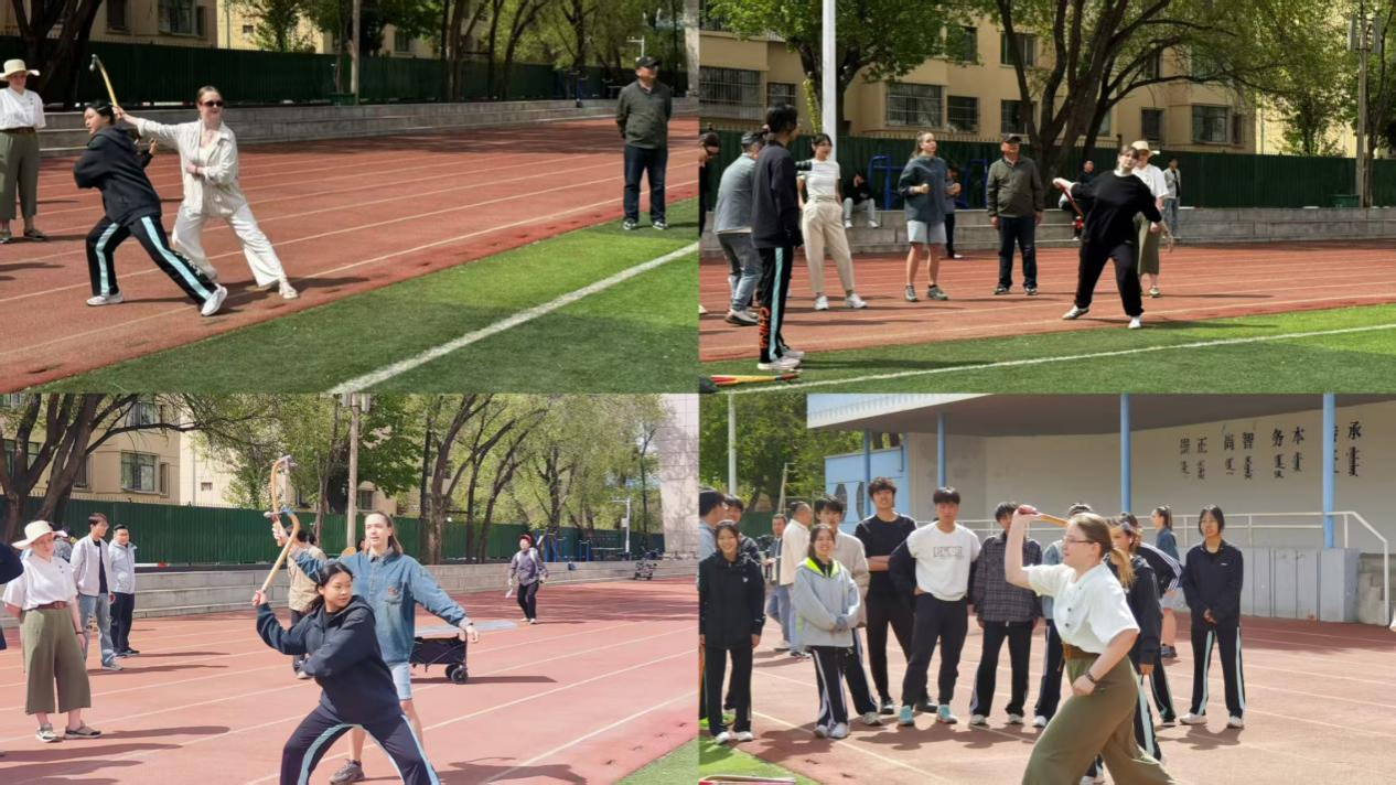 活动当日,操场和场馆里热闹非凡,博克、布鲁、射箭、沙嘎等蒙古族传统体育项目依次展开。博克赛场上,学生分组学习摔跤技巧,感受力量之美;布鲁投掷区,大家手持长柄布鲁,尝试投远投准;射箭场地,留学生在专业老师帮助下拉弓射箭;沙嘎游戏则让现场气氛不断升温。