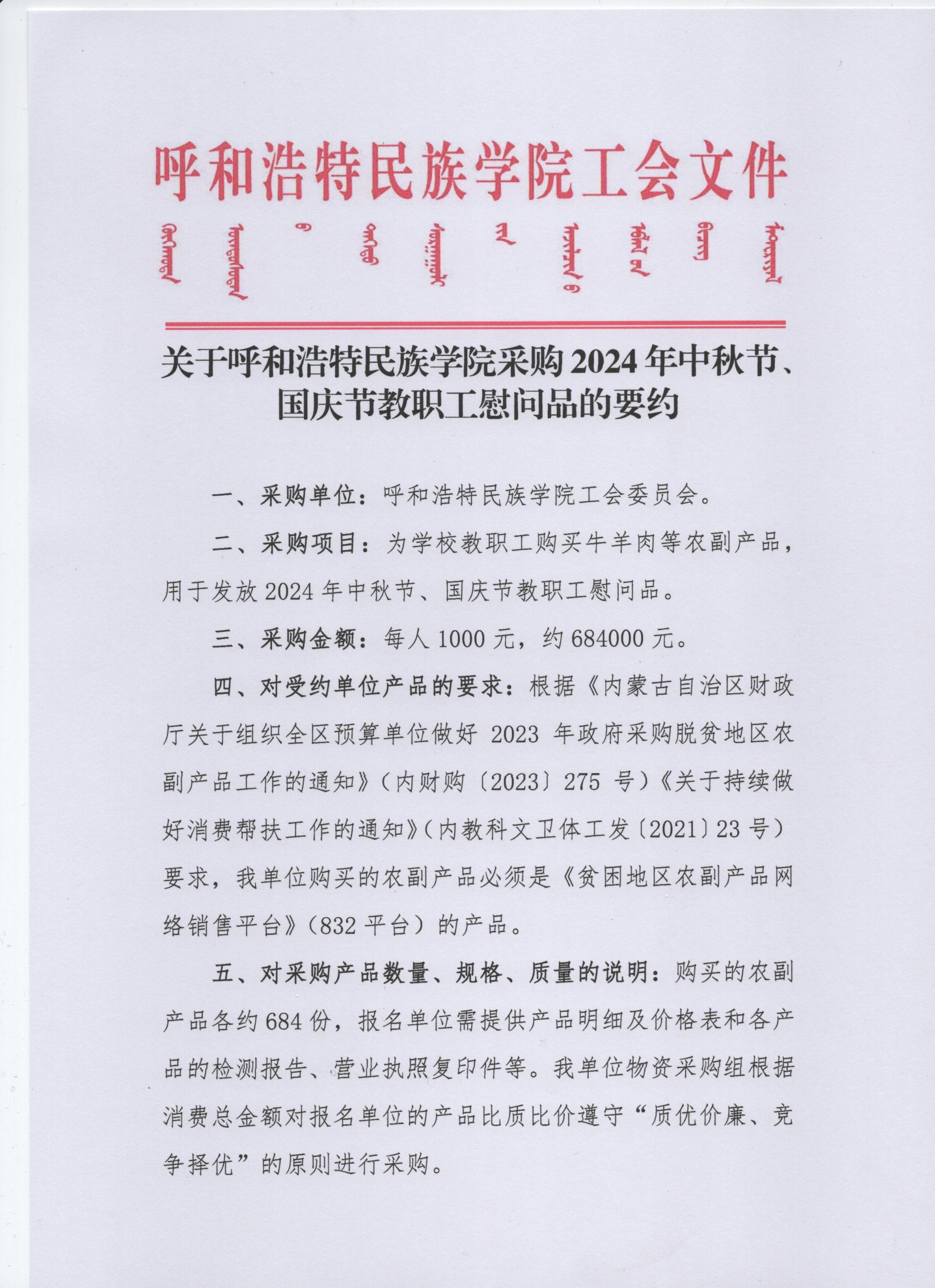关于Beat365唯一官方网站采购2024年中秋节、国庆节教职工慰问品的要约