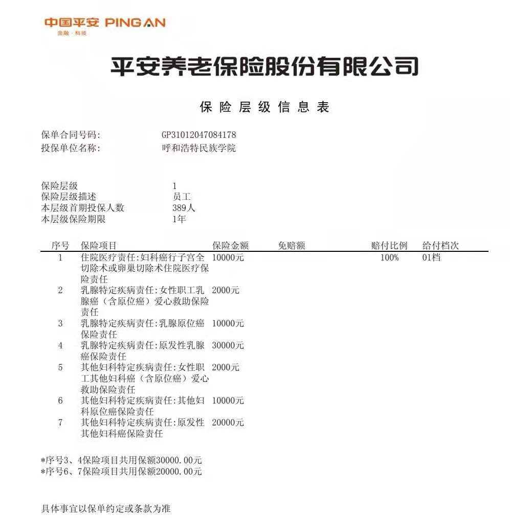 工会还为全校389名在职女教职工办理了“特病保险”,保险费共计壹万肆仟柒佰捌拾贰元(14782元)全部由学校工会支付,保险期限为1年,自2021年5月23日零时起至2022年5月22日二十四时止。