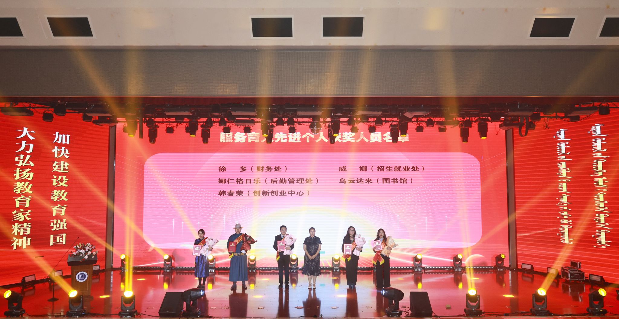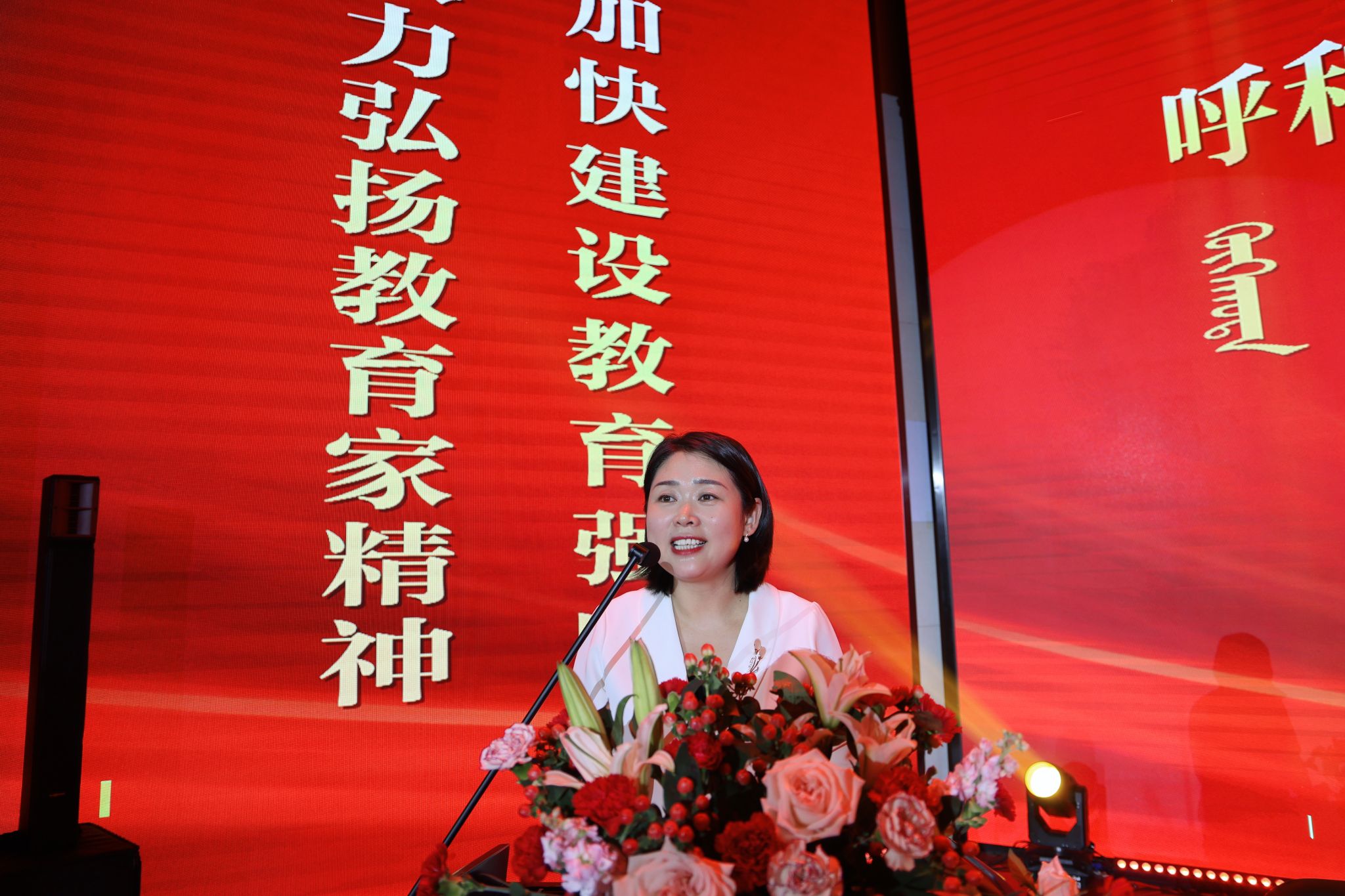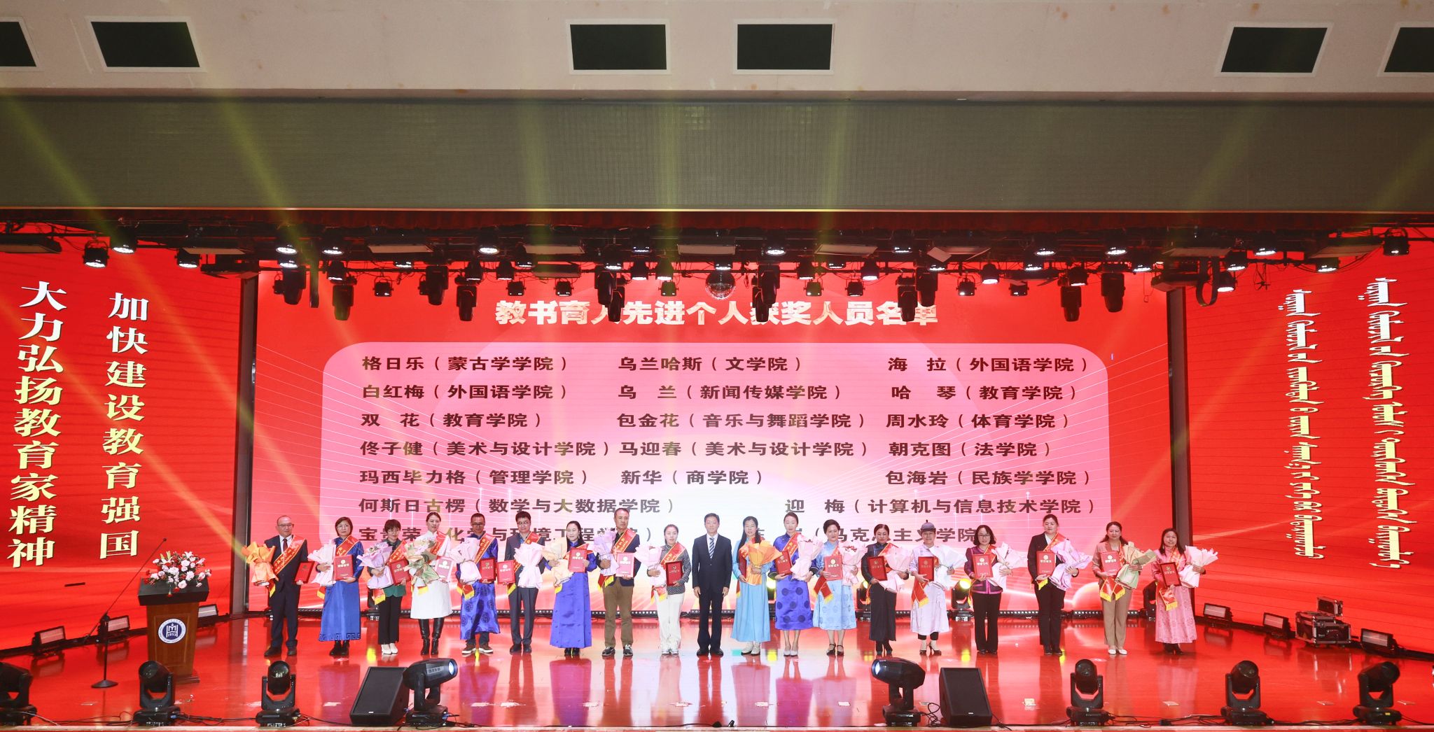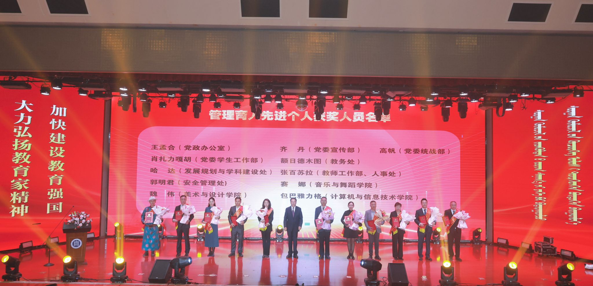迎来第40个教师节之际,9月10日晚上,学校在铸牢中华民族共同体意识教育馆二楼报告厅举行“大力弘扬教育家精神 加快建设教育强国”为主题的2024年教师节庆祝表彰大会。校党委书记刘九万,党委副书记格根哈斯,党委委员、纪委书记、监察专员王冬梅,党委委员、副校长高喜天,党委委员、副校长额尔敦布和,党委委员、副校长双虎出席表彰大会。全校党员干部、一线教师代表,退休教师代表及全体受表彰教师参加表彰大会。大会由刘瑞鸿主持。