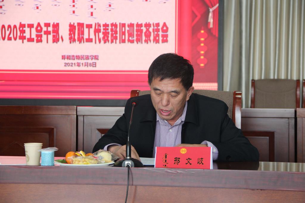 校党委委员、党政办主任朝格吉乐图致辞,他首先向在座的各位并通过他们向全体教职员工致以新年的祝福,对一年来为工会工作,辛勤付出的教职工表示诚挚的慰问和衷心的感谢!同时对2020年的工作进行了简要的回顾并对2021年的工作进行了展望。