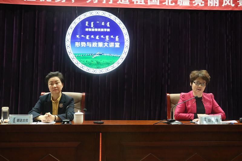 胡达古拉主席首先对中央和自治区党委重大决策部署进行宣传,宣讲了内蒙古自治区改革开放所取得的主要成就和目前我区经济社会发展所呈现出的良好态势,让我们进一步增强了自信心、自豪感和使命感。其次,她以自己童年的不幸经历和励志成人成才的故事,为学生进行了理想信念教育、爱国主义教育、集体主义教育、感恩与诚信教育。最后,针对当代大学生的特征提出应始终把握大局,把准人生正确方向;始终怀有一颗感恩的心;始终把握大学生的主要任务,大学特学;始终保持积极向上、团结友善的当代大学生特性;始终保持自尊自信自立自强的女性“四自精神”;始终保持女性特有的魅力等六个方面的希望。