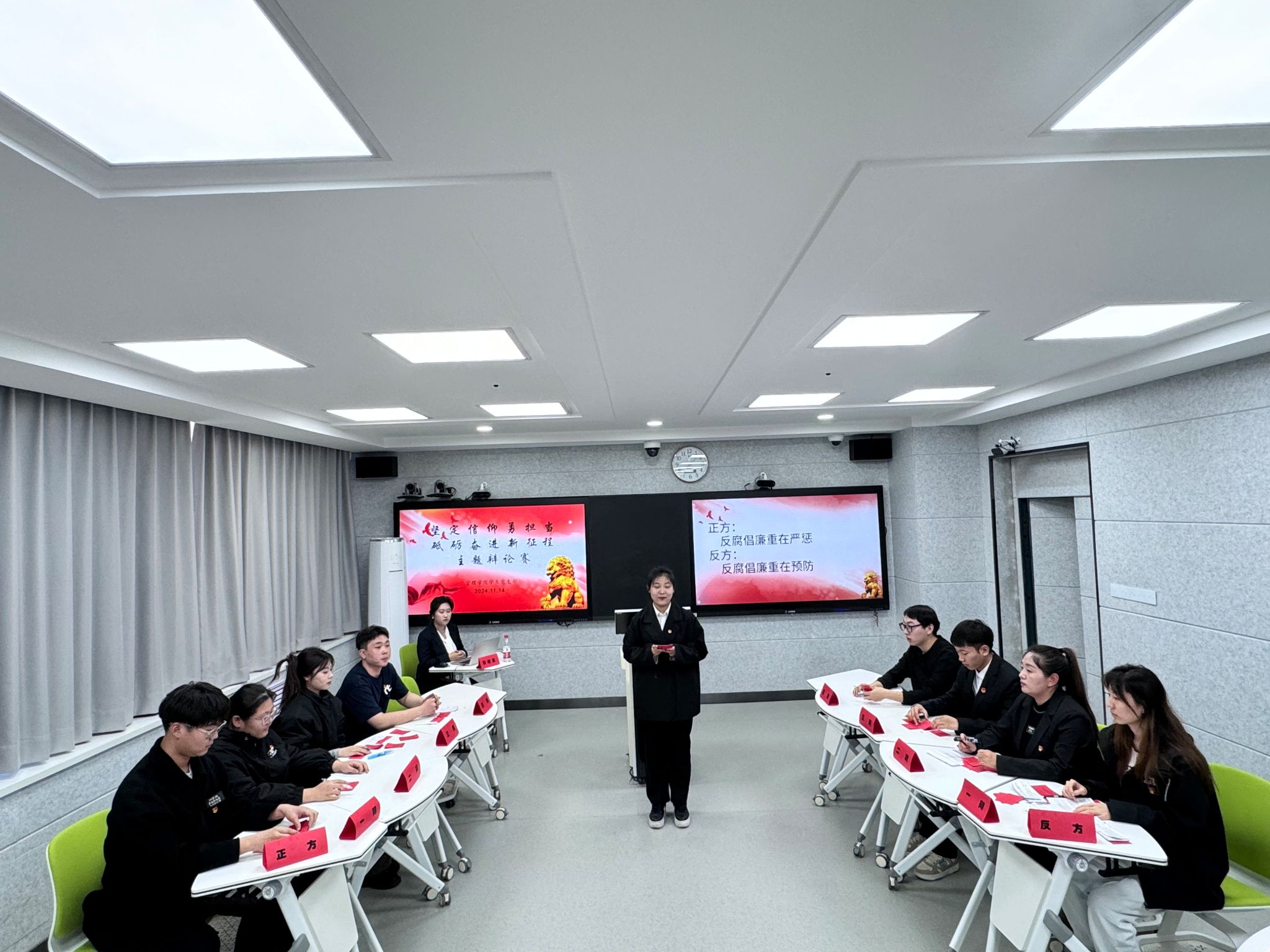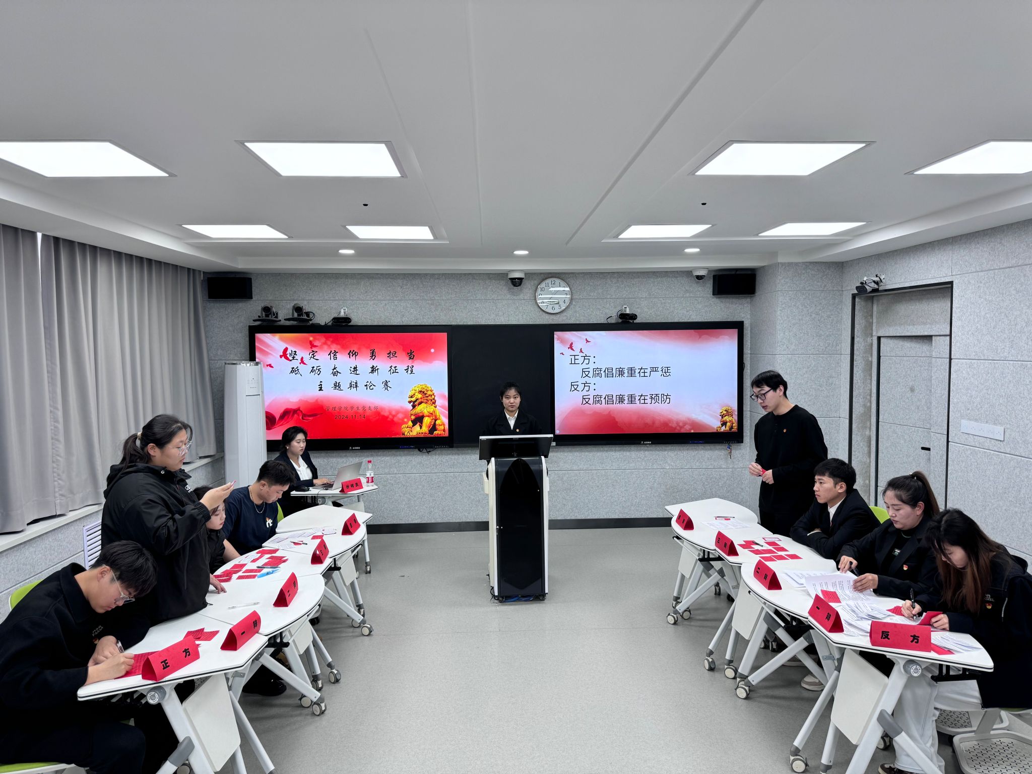 赛场上,由学生党支部积极分子、党员组成的双方辩手你来我往,论据扎实,逻辑严密,妙语连珠。正方以贪腐大案查处后的社会反响为例,强调严惩的警示作用;反方则以完善监督体系避免腐败滋生的事例进行回击。台下观众沉浸其中,掌声不断。