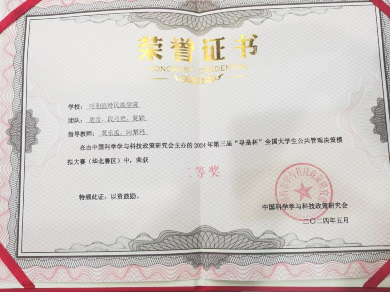 05月25日至26日,第三届“寻是杯”全国大学生公共管理决策模拟大赛(华北赛区)暨公共管理实践教学研讨会在中央财经大学举行。大赛由中国科学学与科技政策研究会主办、中央财经大学政府管理学院承办。我院组织行政管理专业学生组队参赛,与来自华北地区的40支参赛队同台竞技,最终获得大赛二等奖。