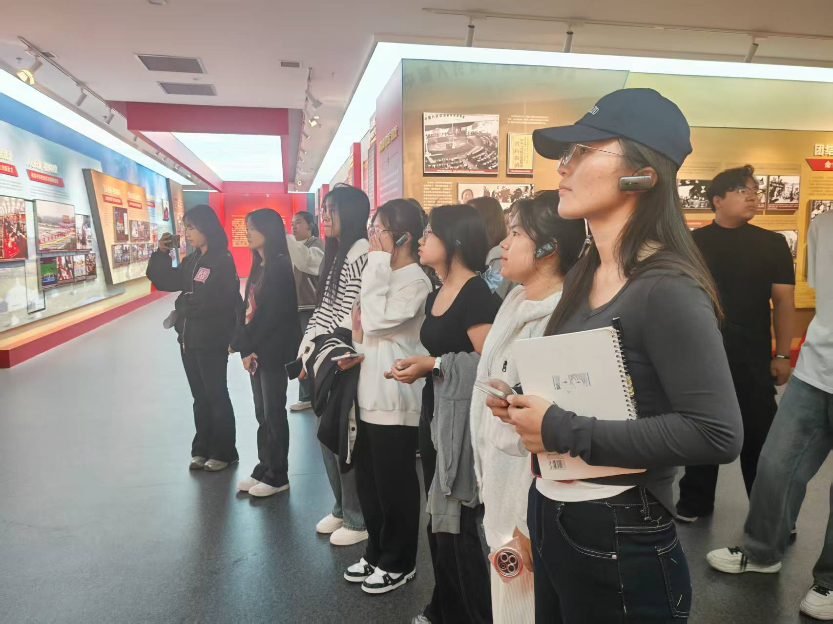 在哈斯同力嘎老师的引导下,同学们步入展厅。教育馆以铸牢中华民族共同体意识为主线,参照《中华民族共同体概论课》,以中华民族共同体的起源、形成和发展为脉络,由“我们从哪里来?”“我们是谁?”“我们要到哪里去?”三大部分构成。详实文献、珍贵影像与沉浸式场景还原相得益彰,生动呈现了中华民族从自在到自觉、迈向伟大复兴的壮阔征程。