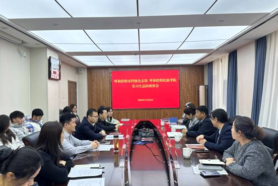 内蒙古自治区档案馆副馆长谷磊、人事处处长高岩及各业务处室负责人,呼和浩特市档案史志馆馆长赵永强、副馆长郝利忠及各业务处室负责人等参会。会上,两馆对实习生在档案整理、数字化加工、档案编研、宣传策划等岗位上的工作表现给予高度评价,肯定同学们展现的扎实专业素养与认真负责的工作态度。两馆馆长还就深化校馆合作、联合培养档案专业人才,共同研讨了合作路径。